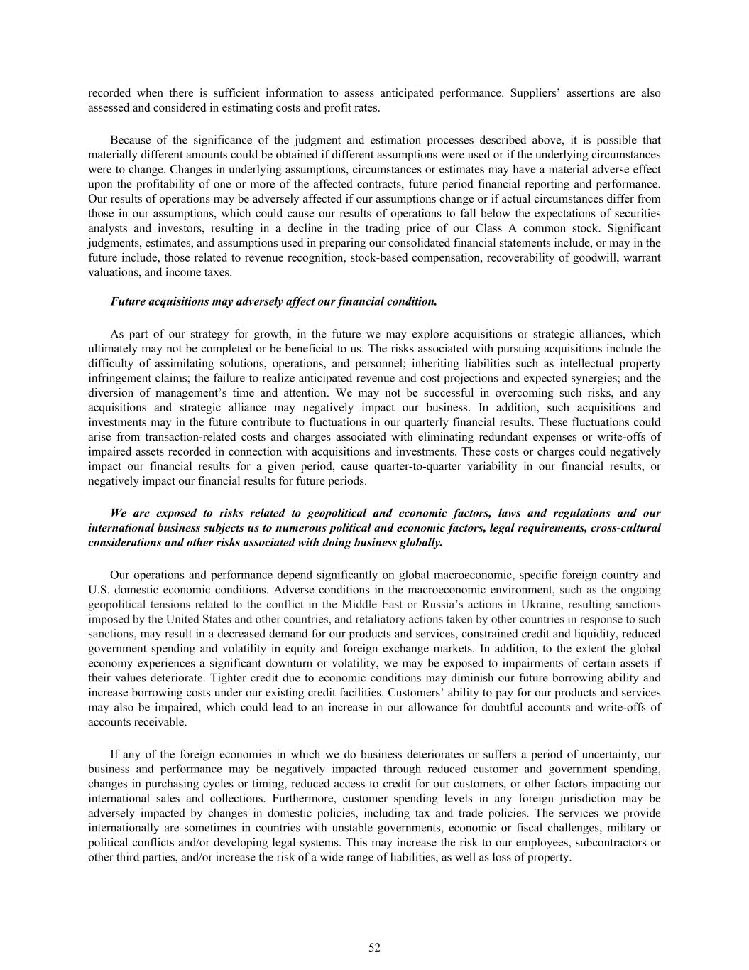 recorded when there is sufficient information to assess anticipated performance. Suppliers’ assertions are also assessed and considered in estimating costs and profit rates. Because of the significance of the judgment and estimation processes described above, it is possible that materially different amounts could be obtained if different assumptions were used or if the underlying circumstances were to change. Changes in underlying assumptions, circumstances or estimates may have a material adverse effect upon the profitability of one or more of the affected contracts, future period financial reporting and performance. Our results of operations may be adversely affected if our assumptions change or if actual circumstances differ from those in our assumptions, which could cause our results of operations to fall below the expectations of securities analysts and investors, resulting in a decline in the trading price of our Class A common stock. Significant judgments, estimates, and assumptions used in preparing our consolidated financial statements include, or may in the future include, those related to revenue recognition, stock-based compensation, recoverability of goodwill, warrant valuations, and income taxes. Future acquisitions may adversely affect our financial condition. As part of our strategy for growth, in the future we may explore acquisitions or strategic alliances, which ultimately may not be completed or be beneficial to us. The risks associated with pursuing acquisitions include the difficulty of assimilating solutions, operations, and personnel; inheriting liabilities such as intellectual property infringement claims; the failure to realize anticipated revenue and cost projections and expected synergies; and the diversion of management’s time and attention. We may not be successful in overcoming such risks, and any acquisitions and strategic alliance may negatively impact our business. In addition, such acquisitions and investments may in the future contribute to fluctuations in our quarterly financial results. These fluctuations could arise from transaction-related costs and charges associated with eliminating redundant expenses or write-offs of impaired assets recorded in connection with acquisitions and investments. These costs or charges could negatively impact our financial results for a given period, cause quarter-to-quarter variability in our financial results, or negatively impact our financial results for future periods. We are exposed to risks related to geopolitical and economic factors, laws and regulations and our international business subjects us to numerous political and economic factors, legal requirements, cross-cultural considerations and other risks associated with doing business globally. Our operations and performance depend significantly on global macroeconomic, specific foreign country and U.S. domestic economic conditions. Adverse conditions in the macroeconomic environment, such as the ongoing geopolitical tensions related to the conflict in the Middle East or Russia’s actions in Ukraine, resulting sanctions imposed by the United States and other countries, and retaliatory actions taken by other countries in response to such sanctions, may result in a decreased demand for our products and services, constrained credit and liquidity, reduced government spending and volatility in equity and foreign exchange markets. In addition, to the extent the global economy experiences a significant downturn or volatility, we may be exposed to impairments of certain assets if their values deteriorate. Tighter credit due to economic conditions may diminish our future borrowing ability and increase borrowing costs under our existing credit facilities. Customers’ ability to pay for our products and services may also be impaired, which could lead to an increase in our allowance for doubtful accounts and write-offs of accounts receivable. If any of the foreign economies in which we do business deteriorates or suffers a period of uncertainty, our business and performance may be negatively impacted through reduced customer and government spending, changes in purchasing cycles or timing, reduced access to credit for our customers, or other factors impacting our international sales and collections. Furthermore, customer spending levels in any foreign jurisdiction may be adversely impacted by changes in domestic policies, including tax and trade policies. The services we provide internationally are sometimes in countries with unstable governments, economic or fiscal challenges, military or political conflicts and/or developing legal systems. This may increase the risk to our employees, subcontractors or other third parties, and/or increase the risk of a wide range of liabilities, as well as loss of property. 52