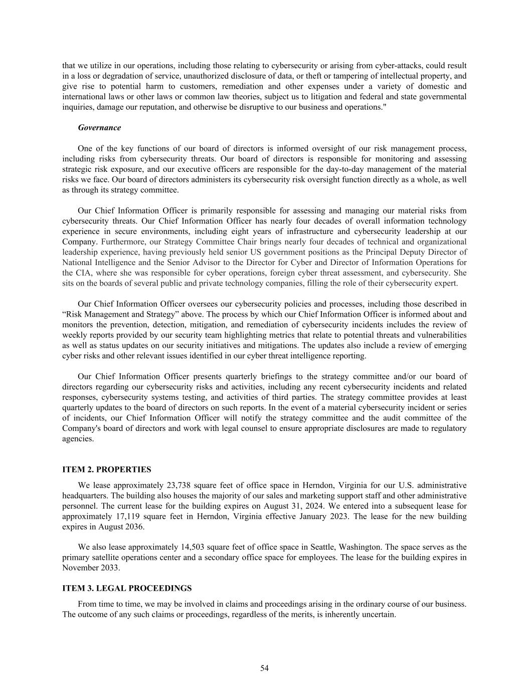 that we utilize in our operations, including those relating to cybersecurity or arising from cyber-attacks, could result in a loss or degradation of service, unauthorized disclosure of data, or theft or tampering of intellectual property, and give rise to potential harm to customers, remediation and other expenses under a variety of domestic and international laws or other laws or common law theories, subject us to litigation and federal and state governmental inquiries, damage our reputation, and otherwise be disruptive to our business and operations." Governance One of the key functions of our board of directors is informed oversight of our risk management process, including risks from cybersecurity threats. Our board of directors is responsible for monitoring and assessing strategic risk exposure, and our executive officers are responsible for the day-to-day management of the material risks we face. Our board of directors administers its cybersecurity risk oversight function directly as a whole, as well as through its strategy committee. Our Chief Information Officer is primarily responsible for assessing and managing our material risks from cybersecurity threats. Our Chief Information Officer has nearly four decades of overall information technology experience in secure environments, including eight years of infrastructure and cybersecurity leadership at our Company. Furthermore, our Strategy Committee Chair brings nearly four decades of technical and organizational leadership experience, having previously held senior US government positions as the Principal Deputy Director of National Intelligence and the Senior Advisor to the Director for Cyber and Director of Information Operations for the CIA, where she was responsible for cyber operations, foreign cyber threat assessment, and cybersecurity. She sits on the boards of several public and private technology companies, filling the role of their cybersecurity expert. Our Chief Information Officer oversees our cybersecurity policies and processes, including those described in “Risk Management and Strategy” above. The process by which our Chief Information Officer is informed about and monitors the prevention, detection, mitigation, and remediation of cybersecurity incidents includes the review of weekly reports provided by our security team highlighting metrics that relate to potential threats and vulnerabilities as well as status updates on our security initiatives and mitigations. The updates also include a review of emerging cyber risks and other relevant issues identified in our cyber threat intelligence reporting. Our Chief Information Officer presents quarterly briefings to the strategy committee and/or our board of directors regarding our cybersecurity risks and activities, including any recent cybersecurity incidents and related responses, cybersecurity systems testing, and activities of third parties. The strategy committee provides at least quarterly updates to the board of directors on such reports. In the event of a material cybersecurity incident or series of incidents, our Chief Information Officer will notify the strategy committee and the audit committee of the Company's board of directors and work with legal counsel to ensure appropriate disclosures are made to regulatory agencies. ITEM 2. PROPERTIES We lease approximately 23,738 square feet of office space in Herndon, Virginia for our U.S. administrative headquarters. The building also houses the majority of our sales and marketing support staff and other administrative personnel. The current lease for the building expires on August 31, 2024. We entered into a subsequent lease for approximately 17,119 square feet in Herndon, Virginia effective January 2023. The lease for the new building expires in August 2036. We also lease approximately 14,503 square feet of office space in Seattle, Washington. The space serves as the primary satellite operations center and a secondary office space for employees. The lease for the building expires in November 2033. ITEM 3. LEGAL PROCEEDINGS From time to time, we may be involved in claims and proceedings arising in the ordinary course of our business. The outcome of any such claims or proceedings, regardless of the merits, is inherently uncertain. 54