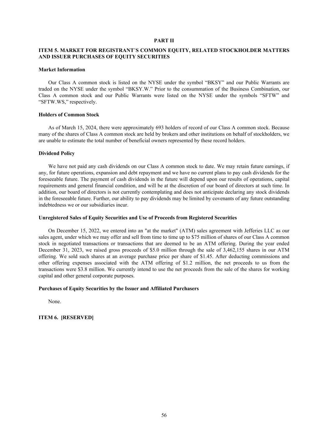 PART II ITEM 5. MARKET FOR REGISTRANT’S COMMON EQUITY, RELATED STOCKHOLDER MATTERS AND ISSUER PURCHASES OF EQUITY SECURITIES Market Information Our Class A common stock is listed on the NYSE under the symbol “BKSY” and our Public Warrants are traded on the NYSE under the symbol “BKSY.W.” Prior to the consummation of the Business Combination, our Class A common stock and our Public Warrants were listed on the NYSE under the symbols “SFTW” and “SFTW.WS,” respectively. Holders of Common Stock As of March 15, 2024, there were approximately 693 holders of record of our Class A common stock. Because many of the shares of Class A common stock are held by brokers and other institutions on behalf of stockholders, we are unable to estimate the total number of beneficial owners represented by these record holders. Dividend Policy We have not paid any cash dividends on our Class A common stock to date. We may retain future earnings, if any, for future operations, expansion and debt repayment and we have no current plans to pay cash dividends for the foreseeable future. The payment of cash dividends in the future will depend upon our results of operations, capital requirements and general financial condition, and will be at the discretion of our board of directors at such time. In addition, our board of directors is not currently contemplating and does not anticipate declaring any stock dividends in the foreseeable future. Further, our ability to pay dividends may be limited by covenants of any future outstanding indebtedness we or our subsidiaries incur. Unregistered Sales of Equity Securities and Use of Proceeds from Registered Securities On December 15, 2022, we entered into an "at the market" (ATM) sales agreement with Jefferies LLC as our sales agent, under which we may offer and sell from time to time up to $75 million of shares of our Class A common stock in negotiated transactions or transactions that are deemed to be an ATM offering. During the year ended December 31, 2023, we raised gross proceeds of $5.0 million through the sale of 3,462,155 shares in our ATM offering. We sold such shares at an average purchase price per share of $1.45. After deducting commissions and other offering expenses associated with the ATM offering of $1.2 million, the net proceeds to us from the transactions were $3.8 million. We currently intend to use the net proceeds from the sale of the shares for working capital and other general corporate purposes. Purchases of Equity Securities by the Issuer and Affiliated Purchasers None. ITEM 6. [RESERVED] 56