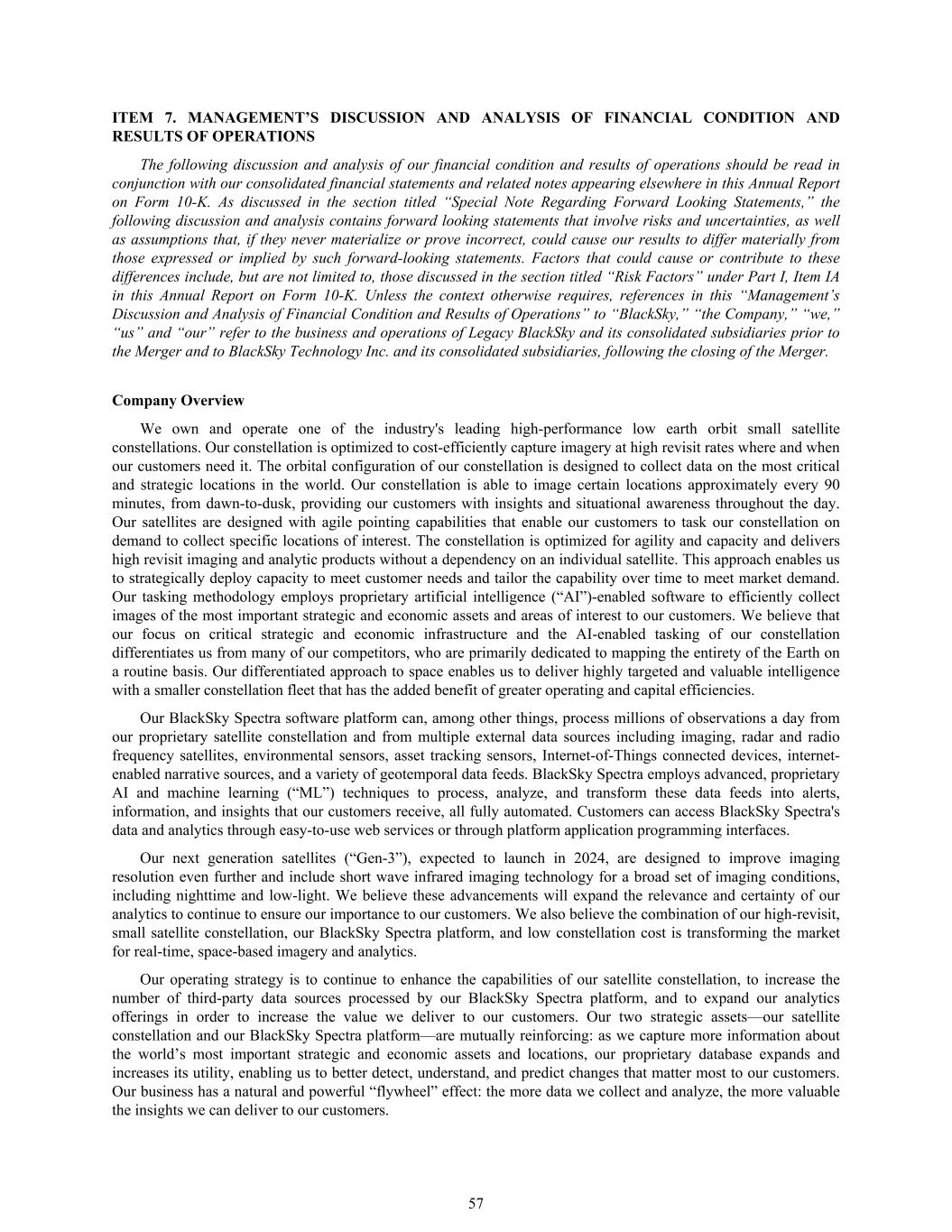 ITEM 7. MANAGEMENT’S DISCUSSION AND ANALYSIS OF FINANCIAL CONDITION AND RESULTS OF OPERATIONS The following discussion and analysis of our financial condition and results of operations should be read in conjunction with our consolidated financial statements and related notes appearing elsewhere in this Annual Report on Form 10-K. As discussed in the section titled “Special Note Regarding Forward Looking Statements,” the following discussion and analysis contains forward looking statements that involve risks and uncertainties, as well as assumptions that, if they never materialize or prove incorrect, could cause our results to differ materially from those expressed or implied by such forward-looking statements. Factors that could cause or contribute to these differences include, but are not limited to, those discussed in the section titled “Risk Factors” under Part I, Item IA in this Annual Report on Form 10-K. Unless the context otherwise requires, references in this “Management’s Discussion and Analysis of Financial Condition and Results of Operations” to “BlackSky,” “the Company,” “we,” “us” and “our” refer to the business and operations of Legacy BlackSky and its consolidated subsidiaries prior to the Merger and to BlackSky Technology Inc. and its consolidated subsidiaries, following the closing of the Merger. Company Overview We own and operate one of the industry's leading high-performance low earth orbit small satellite constellations. Our constellation is optimized to cost-efficiently capture imagery at high revisit rates where and when our customers need it. The orbital configuration of our constellation is designed to collect data on the most critical and strategic locations in the world. Our constellation is able to image certain locations approximately every 90 minutes, from dawn-to-dusk, providing our customers with insights and situational awareness throughout the day. Our satellites are designed with agile pointing capabilities that enable our customers to task our constellation on demand to collect specific locations of interest. The constellation is optimized for agility and capacity and delivers high revisit imaging and analytic products without a dependency on an individual satellite. This approach enables us to strategically deploy capacity to meet customer needs and tailor the capability over time to meet market demand. Our tasking methodology employs proprietary artificial intelligence (“AI”)-enabled software to efficiently collect images of the most important strategic and economic assets and areas of interest to our customers. We believe that our focus on critical strategic and economic infrastructure and the AI-enabled tasking of our constellation differentiates us from many of our competitors, who are primarily dedicated to mapping the entirety of the Earth on a routine basis. Our differentiated approach to space enables us to deliver highly targeted and valuable intelligence with a smaller constellation fleet that has the added benefit of greater operating and capital efficiencies. Our BlackSky Spectra software platform can, among other things, process millions of observations a day from our proprietary satellite constellation and from multiple external data sources including imaging, radar and radio frequency satellites, environmental sensors, asset tracking sensors, Internet-of-Things connected devices, internet- enabled narrative sources, and a variety of geotemporal data feeds. BlackSky Spectra employs advanced, proprietary AI and machine learning (“ML”) techniques to process, analyze, and transform these data feeds into alerts, information, and insights that our customers receive, all fully automated. Customers can access BlackSky Spectra's data and analytics through easy-to-use web services or through platform application programming interfaces. Our next generation satellites (“Gen-3”), expected to launch in 2024, are designed to improve imaging resolution even further and include short wave infrared imaging technology for a broad set of imaging conditions, including nighttime and low-light. We believe these advancements will expand the relevance and certainty of our analytics to continue to ensure our importance to our customers. We also believe the combination of our high-revisit, small satellite constellation, our BlackSky Spectra platform, and low constellation cost is transforming the market for real-time, space-based imagery and analytics. Our operating strategy is to continue to enhance the capabilities of our satellite constellation, to increase the number of third-party data sources processed by our BlackSky Spectra platform, and to expand our analytics offerings in order to increase the value we deliver to our customers. Our two strategic assets—our satellite constellation and our BlackSky Spectra platform—are mutually reinforcing: as we capture more information about the world’s most important strategic and economic assets and locations, our proprietary database expands and increases its utility, enabling us to better detect, understand, and predict changes that matter most to our customers. Our business has a natural and powerful “flywheel” effect: the more data we collect and analyze, the more valuable the insights we can deliver to our customers. 57