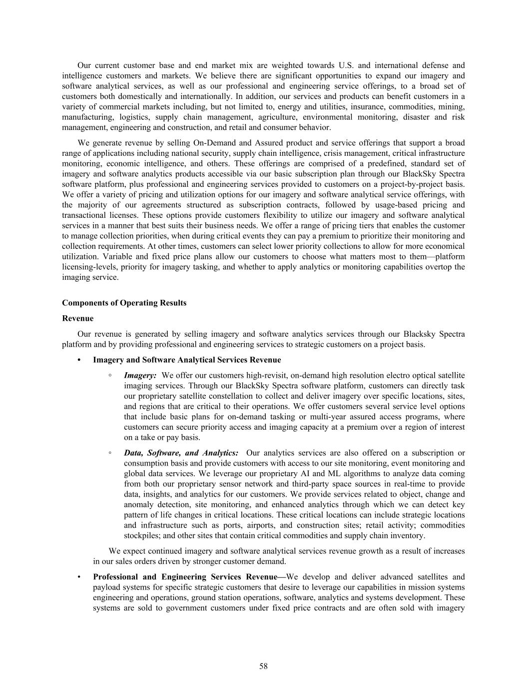 Our current customer base and end market mix are weighted towards U.S. and international defense and intelligence customers and markets. We believe there are significant opportunities to expand our imagery and software analytical services, as well as our professional and engineering service offerings, to a broad set of customers both domestically and internationally. In addition, our services and products can benefit customers in a variety of commercial markets including, but not limited to, energy and utilities, insurance, commodities, mining, manufacturing, logistics, supply chain management, agriculture, environmental monitoring, disaster and risk management, engineering and construction, and retail and consumer behavior. We generate revenue by selling On-Demand and Assured product and service offerings that support a broad range of applications including national security, supply chain intelligence, crisis management, critical infrastructure monitoring, economic intelligence, and others. These offerings are comprised of a predefined, standard set of imagery and software analytics products accessible via our basic subscription plan through our BlackSky Spectra software platform, plus professional and engineering services provided to customers on a project-by-project basis. We offer a variety of pricing and utilization options for our imagery and software analytical service offerings, with the majority of our agreements structured as subscription contracts, followed by usage-based pricing and transactional licenses. These options provide customers flexibility to utilize our imagery and software analytical services in a manner that best suits their business needs. We offer a range of pricing tiers that enables the customer to manage collection priorities, when during critical events they can pay a premium to prioritize their monitoring and collection requirements. At other times, customers can select lower priority collections to allow for more economical utilization. Variable and fixed price plans allow our customers to choose what matters most to them—platform licensing-levels, priority for imagery tasking, and whether to apply analytics or monitoring capabilities overtop the imaging service. Components of Operating Results Revenue Our revenue is generated by selling imagery and software analytics services through our Blacksky Spectra platform and by providing professional and engineering services to strategic customers on a project basis. • Imagery and Software Analytical Services Revenue ◦ Imagery: We offer our customers high-revisit, on-demand high resolution electro optical satellite imaging services. Through our BlackSky Spectra software platform, customers can directly task our proprietary satellite constellation to collect and deliver imagery over specific locations, sites, and regions that are critical to their operations. We offer customers several service level options that include basic plans for on-demand tasking or multi-year assured access programs, where customers can secure priority access and imaging capacity at a premium over a region of interest on a take or pay basis. ◦ Data, Software, and Analytics: Our analytics services are also offered on a subscription or consumption basis and provide customers with access to our site monitoring, event monitoring and global data services. We leverage our proprietary AI and ML algorithms to analyze data coming from both our proprietary sensor network and third-party space sources in real-time to provide data, insights, and analytics for our customers. We provide services related to object, change and anomaly detection, site monitoring, and enhanced analytics through which we can detect key pattern of life changes in critical locations. These critical locations can include strategic locations and infrastructure such as ports, airports, and construction sites; retail activity; commodities stockpiles; and other sites that contain critical commodities and supply chain inventory. We expect continued imagery and software analytical services revenue growth as a result of increases in our sales orders driven by stronger customer demand. • Professional and Engineering Services Revenue—We develop and deliver advanced satellites and payload systems for specific strategic customers that desire to leverage our capabilities in mission systems engineering and operations, ground station operations, software, analytics and systems development. These systems are sold to government customers under fixed price contracts and are often sold with imagery 58