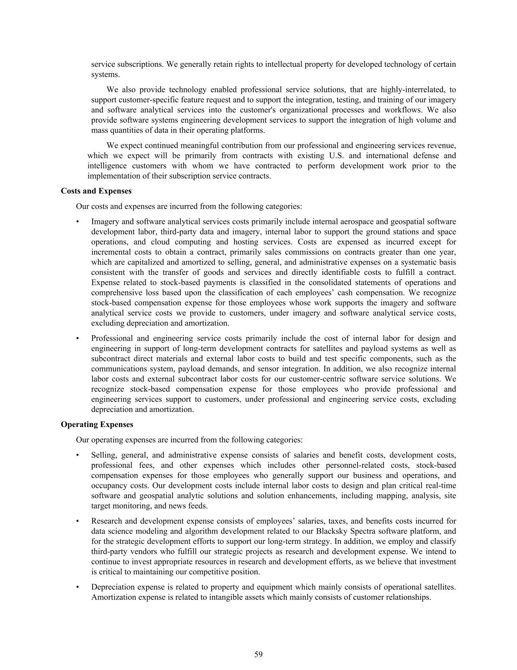 service subscriptions. We generally retain rights to intellectual property for developed technology of certain systems. We also provide technology enabled professional service solutions, that are highly-interrelated, to support customer-specific feature request and to support the integration, testing, and training of our imagery and software analytical services into the customer's organizational processes and workflows. We also provide software systems engineering development services to support the integration of high volume and mass quantities of data in their operating platforms. We expect continued meaningful contribution from our professional and engineering services revenue, which we expect will be primarily from contracts with existing U.S. and international defense and intelligence customers with whom we have contracted to perform development work prior to the implementation of their subscription service contracts. Costs and Expenses Our costs and expenses are incurred from the following categories: • Imagery and software analytical services costs primarily include internal aerospace and geospatial software development labor, third-party data and imagery, internal labor to support the ground stations and space operations, and cloud computing and hosting services. Costs are expensed as incurred except for incremental costs to obtain a contract, primarily sales commissions on contracts greater than one year, which are capitalized and amortized to selling, general, and administrative expenses on a systematic basis consistent with the transfer of goods and services and directly identifiable costs to fulfill a contract. Expense related to stock-based payments is classified in the consolidated statements of operations and comprehensive loss based upon the classification of each employees’ cash compensation. We recognize stock-based compensation expense for those employees whose work supports the imagery and software analytical service costs we provide to customers, under imagery and software analytical service costs, excluding depreciation and amortization. • Professional and engineering service costs primarily include the cost of internal labor for design and engineering in support of long-term development contracts for satellites and payload systems as well as subcontract direct materials and external labor costs to build and test specific components, such as the communications system, payload demands, and sensor integration. In addition, we also recognize internal labor costs and external subcontract labor costs for our customer-centric software service solutions. We recognize stock-based compensation expense for those employees who provide professional and engineering services support to customers, under professional and engineering service costs, excluding depreciation and amortization. Operating Expenses Our operating expenses are incurred from the following categories: • Selling, general, and administrative expense consists of salaries and benefit costs, development costs, professional fees, and other expenses which includes other personnel-related costs, stock-based compensation expenses for those employees who generally support our business and operations, and occupancy costs. Our development costs include internal labor costs to design and plan critical real-time software and geospatial analytic solutions and solution enhancements, including mapping, analysis, site target monitoring, and news feeds. • Research and development expense consists of employees’ salaries, taxes, and benefits costs incurred for data science modeling and algorithm development related to our Blacksky Spectra software platform, and for the strategic development efforts to support our long-term strategy. In addition, we employ and classify third-party vendors who fulfill our strategic projects as research and development expense. We intend to continue to invest appropriate resources in research and development efforts, as we believe that investment is critical to maintaining our competitive position. • Depreciation expense is related to property and equipment which mainly consists of operational satellites. Amortization expense is related to intangible assets which mainly consists of customer relationships. 59