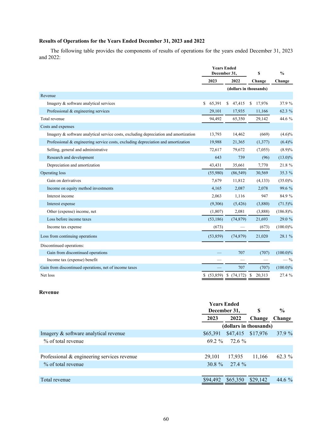 Results of Operations for the Years Ended December 31, 2023 and 2022 The following table provides the components of results of operations for the years ended December 31, 2023 and 2022: Years Ended December 31, $ % 2023 2022 Change Change (dollars in thousands) Revenue Imagery & software analytical services $ 65,391 $ 47,415 $ 17,976 37.9 % Professional & engineering services 29,101 17,935 11,166 62.3 % Total revenue 94,492 65,350 29,142 44.6 % Costs and expenses Imagery & software analytical service costs, excluding depreciation and amortization 13,793 14,462 (669) (4.6) % Professional & engineering service costs, excluding depreciation and amortization 19,988 21,365 (1,377) (6.4) % Selling, general and administrative 72,617 79,672 (7,055) (8.9) % Research and development 643 739 (96) (13.0) % Depreciation and amortization 43,431 35,661 7,770 21.8 % Operating loss (55,980) (86,549) 30,569 35.3 % Gain on derivatives 7,679 11,812 (4,133) (35.0) % Income on equity method investments 4,165 2,087 2,078 99.6 % Interest income 2,063 1,116 947 84.9 % Interest expense (9,306) (5,426) (3,880) (71.5) % Other (expense) income, net (1,807) 2,081 (3,888) (186.8) % Loss before income taxes (53,186) (74,879) 21,693 29.0 % Income tax expense (673) — (673) (100.0) % Loss from continuing operations (53,859) (74,879) 21,020 28.1 % Discontinued operations: Gain from discontinued operations — 707 (707) (100.0) % Income tax (expense) benefit — — — — % Gain from discontinued operations, net of income taxes — 707 (707) (100.0) % Net loss $ (53,859) $ (74,172) $ 20,313 27.4 % Revenue Years Ended December 31, $ % 2023 2022 Change Change (dollars in thousands) Imagery & software analytical revenue $ 65,391 $ 47,415 $ 17,976 37.9 % % of total revenue 69.2 % 72.6 % Professional & engineering services revenue 29,101 17,935 11,166 62.3 % % of total revenue 30.8 % 27.4 % Total revenue $ 94,492 $ 65,350 $ 29,142 44.6 % 60