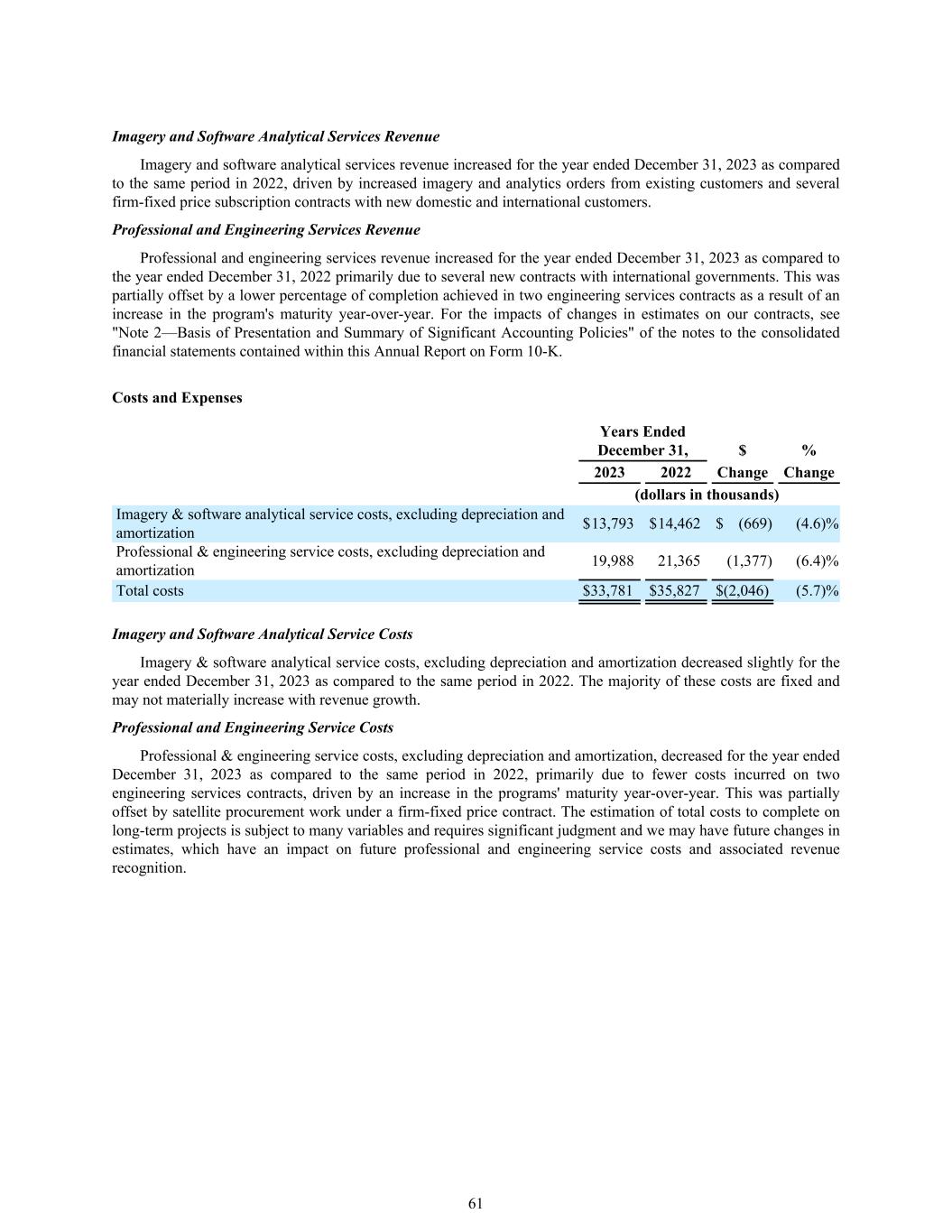 Imagery and Software Analytical Services Revenue Imagery and software analytical services revenue increased for the year ended December 31, 2023 as compared to the same period in 2022, driven by increased imagery and analytics orders from existing customers and several firm-fixed price subscription contracts with new domestic and international customers. Professional and Engineering Services Revenue Professional and engineering services revenue increased for the year ended December 31, 2023 as compared to the year ended December 31, 2022 primarily due to several new contracts with international governments. This was partially offset by a lower percentage of completion achieved in two engineering services contracts as a result of an increase in the program's maturity year-over-year. For the impacts of changes in estimates on our contracts, see "Note 2—Basis of Presentation and Summary of Significant Accounting Policies" of the notes to the consolidated financial statements contained within this Annual Report on Form 10-K. Costs and Expenses Years Ended December 31, $ % 2023 2022 Change Change (dollars in thousands) Imagery & software analytical service costs, excluding depreciation and amortization $ 13,793 $ 14,462 $ (669) (4.6) % Professional & engineering service costs, excluding depreciation and amortization 19,988 21,365 (1,377) (6.4) % Total costs $ 33,781 $ 35,827 $ (2,046) (5.7) % Imagery and Software Analytical Service Costs Imagery & software analytical service costs, excluding depreciation and amortization decreased slightly for the year ended December 31, 2023 as compared to the same period in 2022. The majority of these costs are fixed and may not materially increase with revenue growth. Professional and Engineering Service Costs Professional & engineering service costs, excluding depreciation and amortization, decreased for the year ended December 31, 2023 as compared to the same period in 2022, primarily due to fewer costs incurred on two engineering services contracts, driven by an increase in the programs' maturity year-over-year. This was partially offset by satellite procurement work under a firm-fixed price contract. The estimation of total costs to complete on long-term projects is subject to many variables and requires significant judgment and we may have future changes in estimates, which have an impact on future professional and engineering service costs and associated revenue recognition. 61