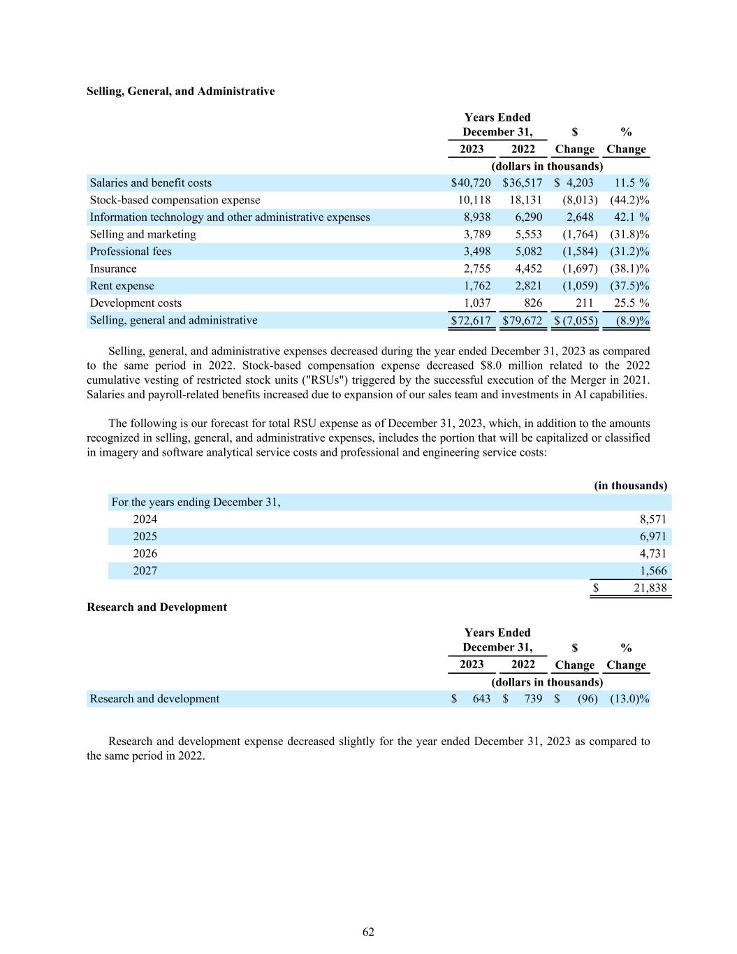 Selling, General, and Administrative Years Ended December 31, $ % 2023 2022 Change Change (dollars in thousands) Salaries and benefit costs $ 40,720 $ 36,517 $ 4,203 11.5 % Stock-based compensation expense 10,118 18,131 (8,013) (44.2) % Information technology and other administrative expenses 8,938 6,290 2,648 42.1 % Selling and marketing 3,789 5,553 (1,764) (31.8) % Professional fees 3,498 5,082 (1,584) (31.2) % Insurance 2,755 4,452 (1,697) (38.1) % Rent expense 1,762 2,821 (1,059) (37.5) % Development costs 1,037 826 211 25.5 % Selling, general and administrative $ 72,617 $ 79,672 $ (7,055) (8.9) % Selling, general, and administrative expenses decreased during the year ended December 31, 2023 as compared to the same period in 2022. Stock-based compensation expense decreased $8.0 million related to the 2022 cumulative vesting of restricted stock units ("RSUs") triggered by the successful execution of the Merger in 2021. Salaries and payroll-related benefits increased due to expansion of our sales team and investments in AI capabilities. The following is our forecast for total RSU expense as of December 31, 2023, which, in addition to the amounts recognized in selling, general, and administrative expenses, includes the portion that will be capitalized or classified in imagery and software analytical service costs and professional and engineering service costs: (in thousands) For the years ending December 31, 2024 8,571 2025 6,971 2026 4,731 2027 1,566 $ 21,838 Research and Development Years Ended December 31, $ % 2023 2022 Change Change (dollars in thousands) Research and development $ 643 $ 739 $ (96) (13.0) % Research and development expense decreased slightly for the year ended December 31, 2023 as compared to the same period in 2022. 62