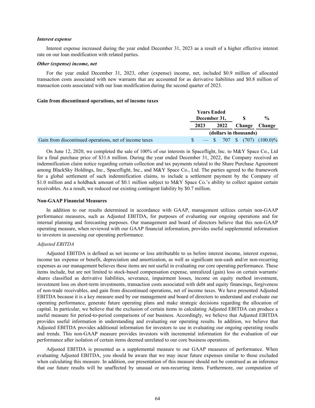 Interest expense Interest expense increased during the year ended December 31, 2023 as a result of a higher effective interest rate on our loan modification with related parties. Other (expense) income, net For the year ended December 31, 2023, other (expense) income, net, included $0.9 million of allocated transaction costs associated with new warrants that are accounted for as derivative liabilities and $0.8 million of transaction costs associated with our loan modification during the second quarter of 2023. Gain from discontinued operations, net of income taxes Years Ended December 31, $ % 2023 2022 Change Change (dollars in thousands) Gain from discontinued operations, net of income taxes $ — $ 707 $ (707) (100.0) % On June 12, 2020, we completed the sale of 100% of our interests in Spaceflight, Inc. to M&Y Space Co., Ltd for a final purchase price of $31.6 million. During the year ended December 31, 2022, the Company received an indemnification claim notice regarding certain collection and tax payments related to the Share Purchase Agreement among BlackSky Holdings, Inc., Spaceflight, Inc., and M&Y Space Co., Ltd. The parties agreed to the framework for a global settlement of such indemnification claims, to include a settlement payment by the Company of $1.0 million and a holdback amount of $0.1 million subject to M&Y Space Co.’s ability to collect against certain receivables. As a result, we reduced our existing contingent liability by $0.7 million. Non-GAAP Financial Measures In addition to our results determined in accordance with GAAP, management utilizes certain non-GAAP performance measures, such as Adjusted EBITDA, for purposes of evaluating our ongoing operations and for internal planning and forecasting purposes. Our management and board of directors believe that this non-GAAP operating measure, when reviewed with our GAAP financial information, provides useful supplemental information to investors in assessing our operating performance. Adjusted EBITDA Adjusted EBITDA is defined as net income or loss attributable to us before interest income, interest expense, income tax expense or benefit, depreciation and amortization, as well as significant non-cash and/or non-recurring expenses as our management believes these items are not useful in evaluating our core operating performance. These items include, but are not limited to stock-based compensation expense, unrealized (gain) loss on certain warrants/ shares classified as derivative liabilities, severance, impairment losses, income on equity method investment, investment loss on short-term investments, transaction costs associated with debt and equity financings, forgiveness of non-trade receivables, and gain from discontinued operations, net of income taxes. We have presented Adjusted EBITDA because it is a key measure used by our management and board of directors to understand and evaluate our operating performance, generate future operating plans and make strategic decisions regarding the allocation of capital. In particular, we believe that the exclusion of certain items in calculating Adjusted EBITDA can produce a useful measure for period-to-period comparisons of our business. Accordingly, we believe that Adjusted EBITDA provides useful information in understanding and evaluating our operating results. In addition, we believe that Adjusted EBITDA provides additional information for investors to use in evaluating our ongoing operating results and trends. This non-GAAP measure provides investors with incremental information for the evaluation of our performance after isolation of certain items deemed unrelated to our core business operations. Adjusted EBITDA is presented as a supplemental measure to our GAAP measures of performance. When evaluating Adjusted EBITDA, you should be aware that we may incur future expenses similar to those excluded when calculating this measure. In addition, our presentation of this measure should not be construed as an inference that our future results will be unaffected by unusual or non-recurring items. Furthermore, our computation of 64