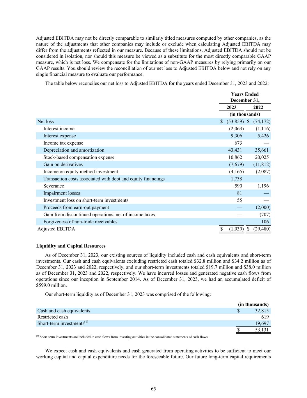 Adjusted EBITDA may not be directly comparable to similarly titled measures computed by other companies, as the nature of the adjustments that other companies may include or exclude when calculating Adjusted EBITDA may differ from the adjustments reflected in our measure. Because of these limitations, Adjusted EBITDA should not be considered in isolation, nor should this measure be viewed as a substitute for the most directly comparable GAAP measure, which is net loss. We compensate for the limitations of non-GAAP measures by relying primarily on our GAAP results. You should review the reconciliation of our net loss to Adjusted EBITDA below and not rely on any single financial measure to evaluate our performance. The table below reconciles our net loss to Adjusted EBITDA for the years ended December 31, 2023 and 2022: Years Ended December 31, 2023 2022 (in thousands) Net loss $ (53,859) $ (74,172) Interest income (2,063) (1,116) Interest expense 9,306 5,426 Income tax expense 673 — Depreciation and amortization 43,431 35,661 Stock-based compensation expense 10,862 20,025 Gain on derivatives (7,679) (11,812) Income on equity method investment (4,165) (2,087) Transaction costs associated with debt and equity financings 1,738 — Severance 590 1,196 Impairment losses 81 — Investment loss on short-term investments 55 — Proceeds from earn-out payment — (2,000) Gain from discontinued operations, net of income taxes — (707) Forgiveness of non-trade receivables — 106 Adjusted EBITDA $ (1,030) $ (29,480) Liquidity and Capital Resources As of December 31, 2023, our existing sources of liquidity included cash and cash equivalents and short-term investments. Our cash and cash equivalents excluding restricted cash totaled $32.8 million and $34.2 million as of December 31, 2023 and 2022, respectively, and our short-term investments totaled $19.7 million and $38.0 million as of December 31, 2023 and 2022, respectively. We have incurred losses and generated negative cash flows from operations since our inception in September 2014. As of December 31, 2023, we had an accumulated deficit of $599.0 million. Our short-term liquidity as of December 31, 2023 was comprised of the following: (in thousands) Cash and cash equivalents $ 32,815 Restricted cash 619 Short-term investments(1) 19,697 $ 53,131 (1) Short-term investments are included in cash flows from investing activities in the consolidated statements of cash flows. We expect cash and cash equivalents and cash generated from operating activities to be sufficient to meet our working capital and capital expenditure needs for the foreseeable future. Our future long-term capital requirements 65