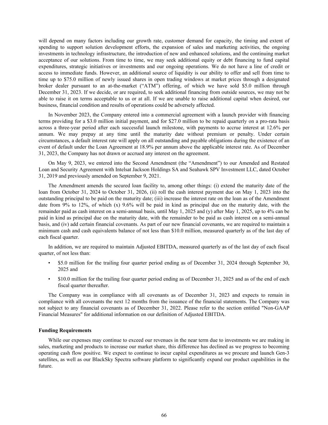 will depend on many factors including our growth rate, customer demand for capacity, the timing and extent of spending to support solution development efforts, the expansion of sales and marketing activities, the ongoing investments in technology infrastructure, the introduction of new and enhanced solutions, and the continuing market acceptance of our solutions. From time to time, we may seek additional equity or debt financing to fund capital expenditures, strategic initiatives or investments and our ongoing operations. We do not have a line of credit or access to immediate funds. However, an additional source of liquidity is our ability to offer and sell from time to time up to $75.0 million of newly issued shares in open trading windows at market prices through a designated broker dealer pursuant to an at-the-market (“ATM”) offering, of which we have sold $5.0 million through December 31, 2023. If we decide, or are required, to seek additional financing from outside sources, we may not be able to raise it on terms acceptable to us or at all. If we are unable to raise additional capital when desired, our business, financial condition and results of operations could be adversely affected. In November 2023, the Company entered into a commercial agreement with a launch provider with financing terms providing for a $3.0 million initial payment, and for $27.0 million to be repaid quarterly on a pro-rata basis across a three-year period after each successful launch milestone, with payments to accrue interest at 12.6% per annum. We may prepay at any time until the maturity date without premium or penalty. Under certain circumstances, a default interest rate will apply on all outstanding and payable obligations during the existence of an event of default under the Loan Agreement at 18.9% per annum above the applicable interest rate. As of December 31, 2023, the Company has not drawn or accrued any interest on the agreement. On May 9, 2023, we entered into the Second Amendment (the “Amendment”) to our Amended and Restated Loan and Security Agreement with Intelsat Jackson Holdings SA and Seahawk SPV Investment LLC, dated October 31, 2019 and previously amended on September 9, 2021. The Amendment amends the secured loan facility to, among other things: (i) extend the maturity date of the loan from October 31, 2024 to October 31, 2026, (ii) roll the cash interest payment due on May 1, 2023 into the outstanding principal to be paid on the maturity date; (iii) increase the interest rate on the loan as of the Amendment date from 9% to 12%, of which (x) 9.6% will be paid in kind as principal due on the maturity date, with the remainder paid as cash interest on a semi-annual basis, until May 1, 2025 and (y) after May 1, 2025, up to 4% can be paid in kind as principal due on the maturity date, with the remainder to be paid as cash interest on a semi-annual basis, and (iv) add certain financial covenants. As part of our new financial covenants, we are required to maintain a minimum cash and cash equivalents balance of not less than $10.0 million, measured quarterly as of the last day of each fiscal quarter. In addition, we are required to maintain Adjusted EBITDA, measured quarterly as of the last day of each fiscal quarter, of not less than: • $5.0 million for the trailing four quarter period ending as of December 31, 2024 through September 30, 2025 and • $10.0 million for the trailing four quarter period ending as of December 31, 2025 and as of the end of each fiscal quarter thereafter. The Company was in compliance with all covenants as of December 31, 2023 and expects to remain in compliance with all covenants the next 12 months from the issuance of the financial statements. The Company was not subject to any financial covenants as of December 31, 2022. Please refer to the section entitled "Non-GAAP Financial Measures" for additional information on our definition of Adjusted EBITDA. Funding Requirements While our expenses may continue to exceed our revenues in the near term due to investments we are making in sales, marketing and products to increase our market share, this difference has declined as we progress to becoming operating cash flow positive. We expect to continue to incur capital expenditures as we procure and launch Gen-3 satellites, as well as our BlackSky Spectra software platform to significantly expand our product capabilities in the future. 66