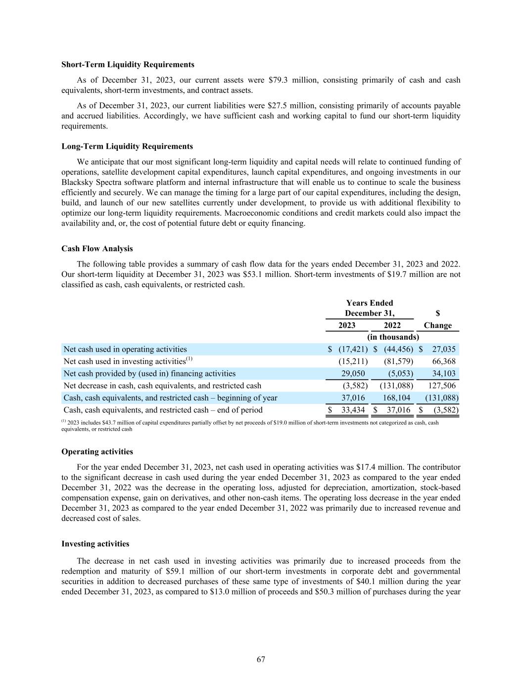 Short-Term Liquidity Requirements As of December 31, 2023, our current assets were $79.3 million, consisting primarily of cash and cash equivalents, short-term investments, and contract assets. As of December 31, 2023, our current liabilities were $27.5 million, consisting primarily of accounts payable and accrued liabilities. Accordingly, we have sufficient cash and working capital to fund our short-term liquidity requirements. Long-Term Liquidity Requirements We anticipate that our most significant long-term liquidity and capital needs will relate to continued funding of operations, satellite development capital expenditures, launch capital expenditures, and ongoing investments in our Blacksky Spectra software platform and internal infrastructure that will enable us to continue to scale the business efficiently and securely. We can manage the timing for a large part of our capital expenditures, including the design, build, and launch of our new satellites currently under development, to provide us with additional flexibility to optimize our long-term liquidity requirements. Macroeconomic conditions and credit markets could also impact the availability and, or, the cost of potential future debt or equity financing. Cash Flow Analysis The following table provides a summary of cash flow data for the years ended December 31, 2023 and 2022. Our short-term liquidity at December 31, 2023 was $53.1 million. Short-term investments of $19.7 million are not classified as cash, cash equivalents, or restricted cash. Years Ended December 31, $ 2023 2022 Change (in thousands) Net cash used in operating activities $ (17,421) $ (44,456) $ 27,035 Net cash used in investing activities(1) (15,211) (81,579) 66,368 Net cash provided by (used in) financing activities 29,050 (5,053) 34,103 Net decrease in cash, cash equivalents, and restricted cash (3,582) (131,088) 127,506 Cash, cash equivalents, and restricted cash – beginning of year 37,016 168,104 (131,088) Cash, cash equivalents, and restricted cash – end of period $ 33,434 $ 37,016 $ (3,582) (1) 2023 includes $43.7 million of capital expenditures partially offset by net proceeds of $19.0 million of short-term investments not categorized as cash, cash equivalents, or restricted cash Operating activities For the year ended December 31, 2023, net cash used in operating activities was $17.4 million. The contributor to the significant decrease in cash used during the year ended December 31, 2023 as compared to the year ended December 31, 2022 was the decrease in the operating loss, adjusted for depreciation, amortization, stock-based compensation expense, gain on derivatives, and other non-cash items. The operating loss decrease in the year ended December 31, 2023 as compared to the year ended December 31, 2022 was primarily due to increased revenue and decreased cost of sales. Investing activities The decrease in net cash used in investing activities was primarily due to increased proceeds from the redemption and maturity of $59.1 million of our short-term investments in corporate debt and governmental securities in addition to decreased purchases of these same type of investments of $40.1 million during the year ended December 31, 2023, as compared to $13.0 million of proceeds and $50.3 million of purchases during the year 67