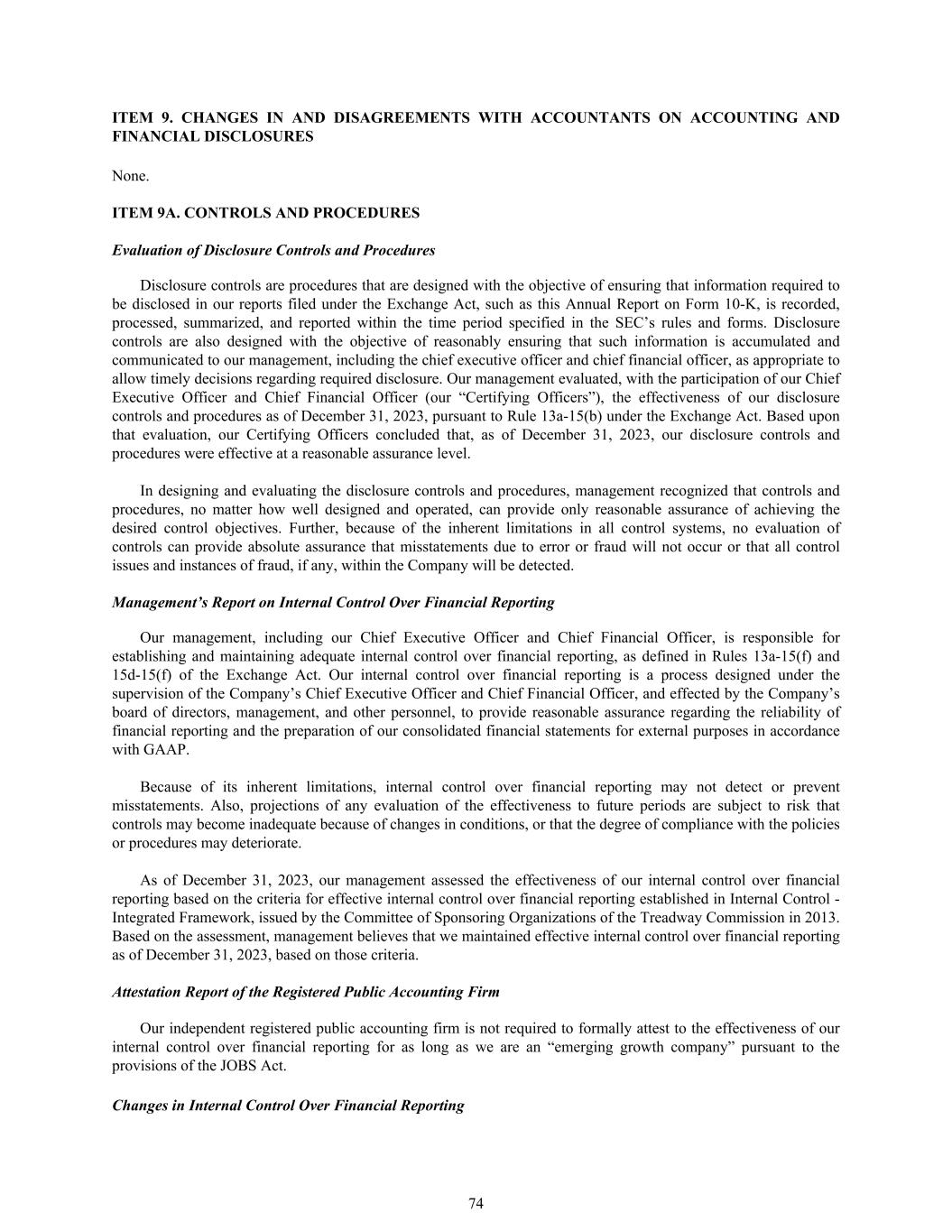ITEM 9. CHANGES IN AND DISAGREEMENTS WITH ACCOUNTANTS ON ACCOUNTING AND FINANCIAL DISCLOSURES None. ITEM 9A. CONTROLS AND PROCEDURES Evaluation of Disclosure Controls and Procedures Disclosure controls are procedures that are designed with the objective of ensuring that information required to be disclosed in our reports filed under the Exchange Act, such as this Annual Report on Form 10-K, is recorded, processed, summarized, and reported within the time period specified in the SEC’s rules and forms. Disclosure controls are also designed with the objective of reasonably ensuring that such information is accumulated and communicated to our management, including the chief executive officer and chief financial officer, as appropriate to allow timely decisions regarding required disclosure. Our management evaluated, with the participation of our Chief Executive Officer and Chief Financial Officer (our “Certifying Officers”), the effectiveness of our disclosure controls and procedures as of December 31, 2023, pursuant to Rule 13a-15(b) under the Exchange Act. Based upon that evaluation, our Certifying Officers concluded that, as of December 31, 2023, our disclosure controls and procedures were effective at a reasonable assurance level. In designing and evaluating the disclosure controls and procedures, management recognized that controls and procedures, no matter how well designed and operated, can provide only reasonable assurance of achieving the desired control objectives. Further, because of the inherent limitations in all control systems, no evaluation of controls can provide absolute assurance that misstatements due to error or fraud will not occur or that all control issues and instances of fraud, if any, within the Company will be detected. Management’s Report on Internal Control Over Financial Reporting Our management, including our Chief Executive Officer and Chief Financial Officer, is responsible for establishing and maintaining adequate internal control over financial reporting, as defined in Rules 13a-15(f) and 15d-15(f) of the Exchange Act. Our internal control over financial reporting is a process designed under the supervision of the Company’s Chief Executive Officer and Chief Financial Officer, and effected by the Company’s board of directors, management, and other personnel, to provide reasonable assurance regarding the reliability of financial reporting and the preparation of our consolidated financial statements for external purposes in accordance with GAAP. Because of its inherent limitations, internal control over financial reporting may not detect or prevent misstatements. Also, projections of any evaluation of the effectiveness to future periods are subject to risk that controls may become inadequate because of changes in conditions, or that the degree of compliance with the policies or procedures may deteriorate. As of December 31, 2023, our management assessed the effectiveness of our internal control over financial reporting based on the criteria for effective internal control over financial reporting established in Internal Control - Integrated Framework, issued by the Committee of Sponsoring Organizations of the Treadway Commission in 2013. Based on the assessment, management believes that we maintained effective internal control over financial reporting as of December 31, 2023, based on those criteria. Attestation Report of the Registered Public Accounting Firm Our independent registered public accounting firm is not required to formally attest to the effectiveness of our internal control over financial reporting for as long as we are an “emerging growth company” pursuant to the provisions of the JOBS Act. Changes in Internal Control Over Financial Reporting 74