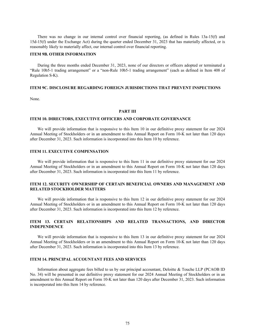There was no change in our internal control over financial reporting, (as defined in Rules 13a-15(f) and 15d-15(f) under the Exchange Act) during the quarter ended December 31, 2023 that has materially affected, or is reasonably likely to materially affect, our internal control over financial reporting. ITEM 9B. OTHER INFORMATION During the three months ended December 31, 2023, none of our directors or officers adopted or terminated a “Rule 10b5-1 trading arrangement” or a “non-Rule 10b5-1 trading arrangement” (each as defined in Item 408 of Regulation S-K). ITEM 9C. DISCLOSURE REGARDING FOREIGN JURISDICTIONS THAT PREVENT INSPECTIONS None. PART III ITEM 10. DIRECTORS, EXECUTIVE OFFICERS AND CORPORATE GOVERNANCE We will provide information that is responsive to this Item 10 in our definitive proxy statement for our 2024 Annual Meeting of Stockholders or in an amendment to this Annual Report on Form 10-K not later than 120 days after December 31, 2023. Such information is incorporated into this Item 10 by reference. ITEM 11. EXECUTIVE COMPENSATION We will provide information that is responsive to this Item 11 in our definitive proxy statement for our 2024 Annual Meeting of Stockholders or in an amendment to this Annual Report on Form 10-K not later than 120 days after December 31, 2023. Such information is incorporated into this Item 11 by reference. ITEM 12. SECURITY OWNERSHIP OF CERTAIN BENEFICIAL OWNERS AND MANAGEMENT AND RELATED STOCKHOLDER MATTERS We will provide information that is responsive to this Item 12 in our definitive proxy statement for our 2024 Annual Meeting of Stockholders or in an amendment to this Annual Report on Form 10-K not later than 120 days after December 31, 2023. Such information is incorporated into this Item 12 by reference. ITEM 13. CERTAIN RELATIONSHIPS AND RELATED TRANSACTIONS, AND DIRECTOR INDEPENDENCE We will provide information that is responsive to this Item 13 in our definitive proxy statement for our 2024 Annual Meeting of Stockholders or in an amendment to this Annual Report on Form 10-K not later than 120 days after December 31, 2023. Such information is incorporated into this Item 13 by reference. ITEM 14. PRINCIPAL ACCOUNTANT FEES AND SERVICES Information about aggregate fees billed to us by our principal accountant, Deloitte & Touche LLP (PCAOB ID No. 34) will be presented in our definitive proxy statement for our 2024 Annual Meeting of Stockholders or in an amendment to this Annual Report on Form 10-K not later than 120 days after December 31, 2023. Such information is incorporated into this Item 14 by reference. 75