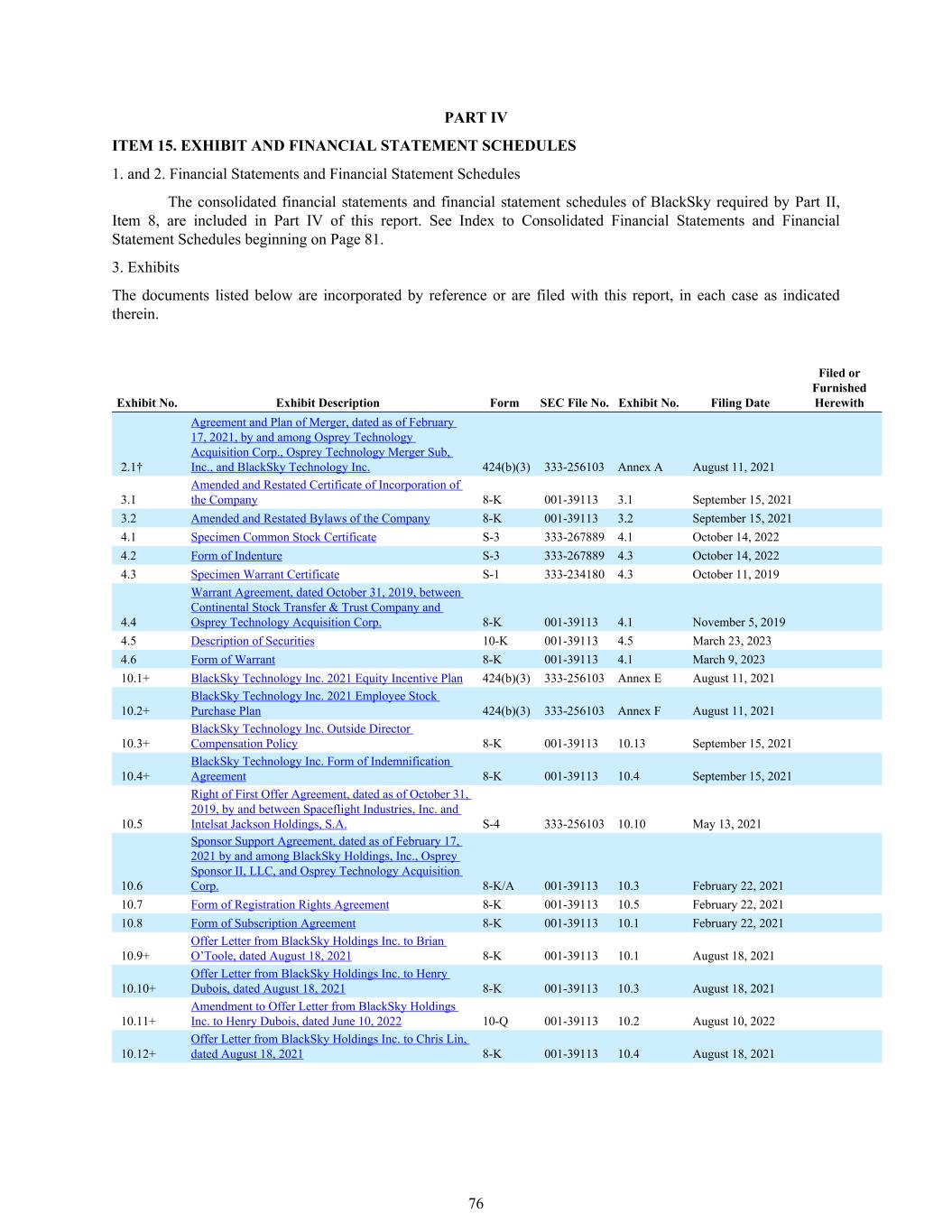 PART IV ITEM 15. EXHIBIT AND FINANCIAL STATEMENT SCHEDULES 1. and 2. Financial Statements and Financial Statement Schedules The consolidated financial statements and financial statement schedules of BlackSky required by Part II, Item 8, are included in Part IV of this report. See Index to Consolidated Financial Statements and Financial Statement Schedules beginning on Page 81. 3. Exhibits The documents listed below are incorporated by reference or are filed with this report, in each case as indicated therein. 2.1† Agreement and Plan of Merger, dated as of February 17, 2021, by and among Osprey Technology Acquisition Corp., Osprey Technology Merger Sub, Inc., and BlackSky Technology Inc. 424(b)(3) 333-256103 Annex A August 11, 2021 3.1 Amended and Restated Certificate of Incorporation of the Company 8-K 001-39113 3.1 September 15, 2021 3.2 Amended and Restated Bylaws of the Company 8-K 001-39113 3.2 September 15, 2021 4.1 Specimen Common Stock Certificate S-3 333-267889 4.1 October 14, 2022 4.2 Form of Indenture S-3 333-267889 4.3 October 14, 2022 4.3 Specimen Warrant Certificate S-1 333-234180 4.3 October 11, 2019 4.4 Warrant Agreement, dated October 31, 2019, between Continental Stock Transfer & Trust Company and Osprey Technology Acquisition Corp. 8-K 001-39113 4.1 November 5, 2019 4.5 Description of Securities 10-K 001-39113 4.5 March 23, 2023 4.6 Form of Warrant 8-K 001-39113 4.1 March 9, 2023 10.1+ BlackSky Technology Inc. 2021 Equity Incentive Plan 424(b)(3) 333-256103 Annex E August 11, 2021 10.2+ BlackSky Technology Inc. 2021 Employee Stock Purchase Plan 424(b)(3) 333-256103 Annex F August 11, 2021 10.3+ BlackSky Technology Inc. Outside Director Compensation Policy 8-K 001-39113 10.13 September 15, 2021 10.4+ BlackSky Technology Inc. Form of Indemnification Agreement 8-K 001-39113 10.4 September 15, 2021 10.5 Right of First Offer Agreement, dated as of October 31, 2019, by and between Spaceflight Industries, Inc. and Intelsat Jackson Holdings, S.A. S-4 333-256103 10.10 May 13, 2021 10.6 Sponsor Support Agreement, dated as of February 17, 2021 by and among BlackSky Holdings, Inc., Osprey Sponsor II, LLC, and Osprey Technology Acquisition Corp. 8-K/A 001-39113 10.3 February 22, 2021 10.7 Form of Registration Rights Agreement 8-K 001-39113 10.5 February 22, 2021 10.8 Form of Subscription Agreement 8-K 001-39113 10.1 February 22, 2021 10.9+ Offer Letter from BlackSky Holdings Inc. to Brian O’Toole, dated August 18, 2021 8-K 001-39113 10.1 August 18, 2021 10.10+ Offer Letter from BlackSky Holdings Inc. to Henry Dubois, dated August 18, 2021 8-K 001-39113 10.3 August 18, 2021 10.11+ Amendment to Offer Letter from BlackSky Holdings Inc. to Henry Dubois, dated June 10, 2022 10-Q 001-39113 10.2 August 10, 2022 10.12+ Offer Letter from BlackSky Holdings Inc. to Chris Lin, dated August 18, 2021 8-K 001-39113 10.4 August 18, 2021 Exhibit No. Exhibit Description Form SEC File No. Exhibit No. Filing Date Filed or Furnished Herewith 76