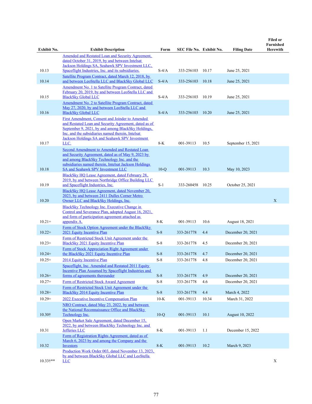 10.13 Amended and Restated Loan and Security Agreement, dated October 31, 2019, by and between Intelsat Jackson Holdings SA, Seahawk SPV Investment LLC, Spaceflight Industries, Inc. and its subsidiaries. S-4/A 333-256103 10.17 June 25, 2021 10.14 Satellite Program Contract, dated March 12, 2018, by and between LeoStella LLC and BlackSky Global LLC S-4/A 333-256103 10.18 June 25, 2021 10.15 Amendment No. 1 to Satellite Program Contract, dated February 20, 2019, by and between LeoStella LLC and BlackSky Global LLC S-4/A 333-256103 10.19 June 25, 2021 10.16 Amendment No. 2 to Satellite Program Contract, dated May 27, 2020, by and between LeoStella LLC and BlackSky Global LLC S-4/A 333-256103 10.20 June 25, 2021 10.17 First Amendment, Consent and Joinder to Amended and Restated Loan and Security Agreement, dated as of September 9, 2021, by and among BlackSky Holdings, Inc. and the subsidiaries named therein, Intelsat Jackson Holdings SA and Seahawk SPV Investment LLC. 8-K 001-39113 10.5 September 15, 2021 10.18 Second Amendment to Amended and Restated Loan and Security Agreement, dated as of May 9, 2023 by and among BlackSky Technology Inc. and the subsidiaries named therein, Intelsat Jackson Holdings SA and Seahawk SPV Investment LLC 10-Q 001-39113 10.3 May 10, 2023 10.19 BlackSky HQ Lease Agreement, dated February 28, 2019, by and between Northridge Office Building LLC and Spaceflight Industries, Inc. S-1 333-260458 10.25 October 25, 2021 10.20 BlackSky HQ Lease Agreement, dated November 20, 2023, by and between 2411 Dulles Corner Metro Owner LLC and BlackSky Holdings, Inc. X 10.21+ BlackSky Technology Inc. Executive Change in Control and Severance Plan, adopted August 16, 2021, and form of participation agreement attached as appendix A. 8-K 001-39113 10.6 August 18, 2021 10.22+ Form of Stock Option Agreement under the BlackSky 2021 Equity Incentive Plan S-8 333-261778 4.4 December 20, 2021 10.23+ Form of Restricted Stock Unit Agreement under the BlackSky 2021 Equity Incentive Plan S-8 333-261778 4.5 December 20, 2021 10.24+ Form of Stock Appreciation Right Agreement under the BlackSky 2021 Equity Incentive Plan S-8 333-261778 4.7 December 20, 2021 10.25+ 2014 Equity Incentive Plan S-8 333-261778 4.8 December 20, 2021 10.26+ Spaceflight, Inc. Amended and Restated 2011 Equity Incentive Plan Assumed by Spaceflight Industries and forms of agreements thereunder S-8 333-261778 4.9 December 20, 2021 10.27+ Form of Restricted Stock Award Agreement S-8 333-261778 4.6 December 20, 2021 10.28+ Form of Restricted Stock Unit Agreement under the BlackSky 2014 Equity Incentive Plan S-8 333-261778 4.4 March 4, 2022 10.29+ 2022 Executive Incentive Compensation Plan 10-K 001-39113 10.34 March 31, 2022 10.30† NRO Contract, dated May 23, 2022, by and between the National Reconnaissance Office and BlackSky Technology Inc. 10-Q 001-39113 10.1 August 10, 2022 10.31 Open Market Sale Agreement, dated December 15, 2022, by and between BlackSky Technology Inc. and Jefferies LLC 8-K 001-39113 1.1 December 15, 2022 10.32 Form of Registration Rights Agreement, dated as of March 6, 2023 by and among the Company and the Investors 8-K 001-39113 10.2 March 9, 2023 10.33†** Production Work Order 003, dated November 13, 2023, by and between BlackSky Global LLC and LeoStella LLC X Exhibit No. Exhibit Description Form SEC File No. Exhibit No. Filing Date Filed or Furnished Herewith 77
