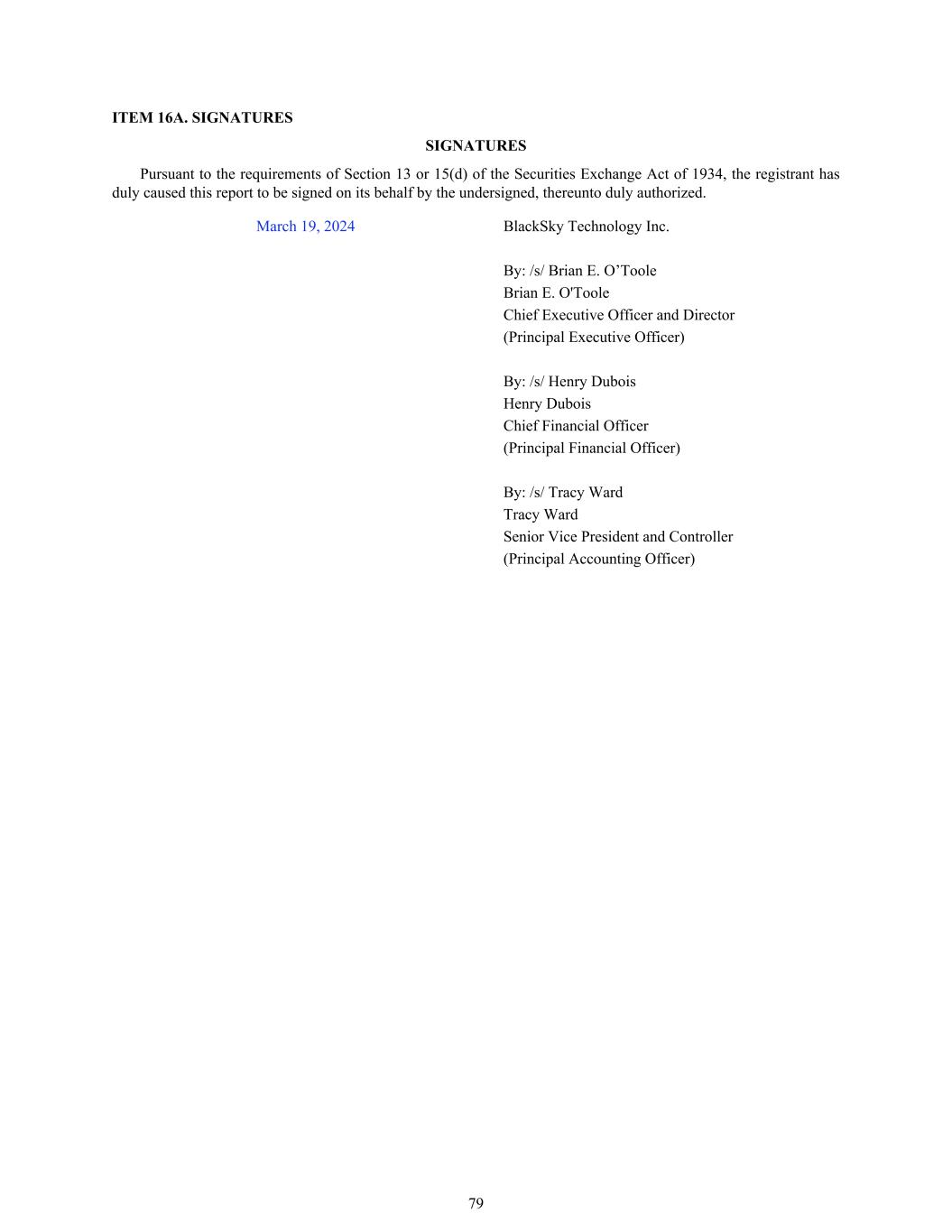 ITEM 16A. SIGNATURES SIGNATURES Pursuant to the requirements of Section 13 or 15(d) of the Securities Exchange Act of 1934, the registrant has duly caused this report to be signed on its behalf by the undersigned, thereunto duly authorized. March 19, 2024 BlackSky Technology Inc. By: /s/ Brian E. O’Toole Brian E. O'Toole Chief Executive Officer and Director (Principal Executive Officer) By: /s/ Henry Dubois Henry Dubois Chief Financial Officer (Principal Financial Officer) By: /s/ Tracy Ward Tracy Ward Senior Vice President and Controller (Principal Accounting Officer) 79
