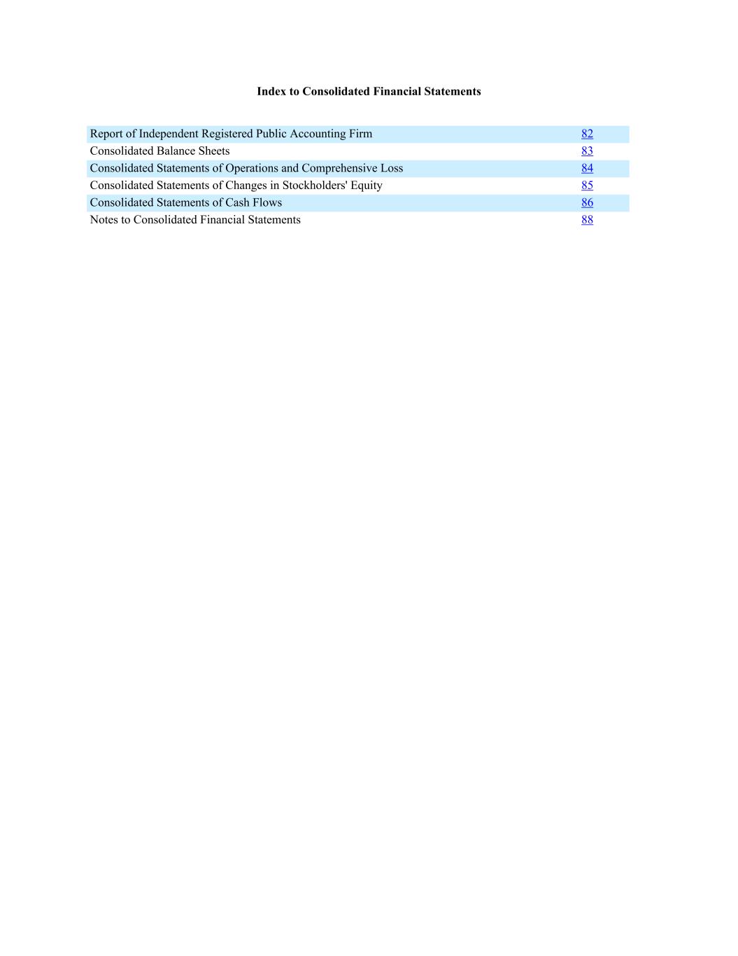 Index to Consolidated Financial Statements Report of Independent Registered Public Accounting Firm 82 Consolidated Balance Sheets 83 Consolidated Statements of Operations and Comprehensive Loss 84 Consolidated Statements of Changes in Stockholders' Equity 85 Consolidated Statements of Cash Flows 86 Notes to Consolidated Financial Statements 88