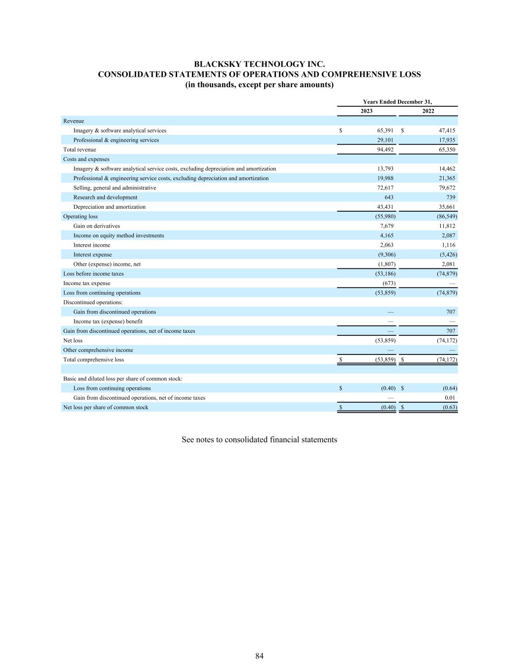 BLACKSKY TECHNOLOGY INC. CONSOLIDATED STATEMENTS OF OPERATIONS AND COMPREHENSIVE LOSS (in thousands, except per share amounts) Years Ended December 31, 2023 2022 Revenue Imagery & software analytical services $ 65,391 $ 47,415 Professional & engineering services 29,101 17,935 Total revenue 94,492 65,350 Costs and expenses Imagery & software analytical service costs, excluding depreciation and amortization 13,793 14,462 Professional & engineering service costs, excluding depreciation and amortization 19,988 21,365 Selling, general and administrative 72,617 79,672 Research and development 643 739 Depreciation and amortization 43,431 35,661 Operating loss (55,980) (86,549) Gain on derivatives 7,679 11,812 Income on equity method investments 4,165 2,087 Interest income 2,063 1,116 Interest expense (9,306) (5,426) Other (expense) income, net (1,807) 2,081 Loss before income taxes (53,186) (74,879) Income tax expense (673) — Loss from continuing operations (53,859) (74,879) Discontinued operations: Gain from discontinued operations — 707 Income tax (expense) benefit — — Gain from discontinued operations, net of income taxes — 707 Net loss (53,859) (74,172) Other comprehensive income — — Total comprehensive loss $ (53,859) $ (74,172) Basic and diluted loss per share of common stock: Loss from continuing operations $ (0.40) $ (0.64) Gain from discontinued operations, net of income taxes — 0.01 Net loss per share of common stock $ (0.40) $ (0.63) See notes to consolidated financial statements 84
