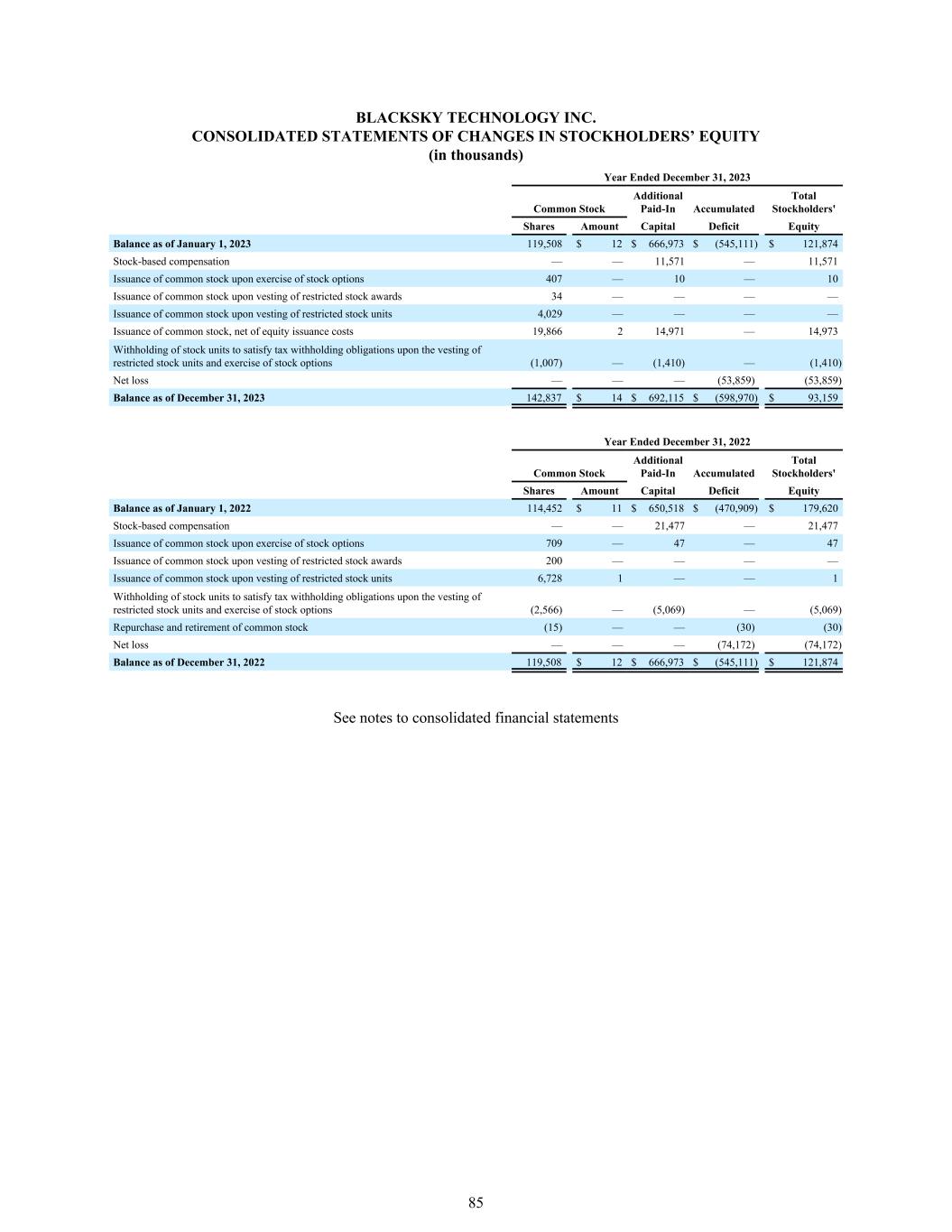 BLACKSKY TECHNOLOGY INC. CONSOLIDATED STATEMENTS OF CHANGES IN STOCKHOLDERS’ EQUITY (in thousands) Year Ended December 31, 2023 Common Stock Additional Paid-In Accumulated Total Stockholders' Shares Amount Capital Deficit Equity Balance as of January 1, 2023 119,508 $ 12 $ 666,973 $ (545,111) $ 121,874 Stock-based compensation — — 11,571 — 11,571 Issuance of common stock upon exercise of stock options 407 — 10 — 10 Issuance of common stock upon vesting of restricted stock awards 34 — — — — Issuance of common stock upon vesting of restricted stock units 4,029 — — — — Issuance of common stock, net of equity issuance costs 19,866 2 14,971 — 14,973 Withholding of stock units to satisfy tax withholding obligations upon the vesting of restricted stock units and exercise of stock options (1,007) — (1,410) — (1,410) Net loss — — — (53,859) (53,859) Balance as of December 31, 2023 142,837 $ 14 $ 692,115 $ (598,970) $ 93,159 Year Ended December 31, 2022 Common Stock Additional Paid-In Accumulated Total Stockholders' Shares Amount Capital Deficit Equity Balance as of January 1, 2022 114,452 $ 11 $ 650,518 $ (470,909) $ 179,620 Stock-based compensation — — 21,477 — 21,477 Issuance of common stock upon exercise of stock options 709 — 47 — 47 Issuance of common stock upon vesting of restricted stock awards 200 — — — — Issuance of common stock upon vesting of restricted stock units 6,728 1 — — 1 Withholding of stock units to satisfy tax withholding obligations upon the vesting of restricted stock units and exercise of stock options (2,566) — (5,069) — (5,069) Repurchase and retirement of common stock (15) — — (30) (30) Net loss — — — (74,172) (74,172) Balance as of December 31, 2022 119,508 $ 12 $ 666,973 $ (545,111) $ 121,874 See notes to consolidated financial statements 85