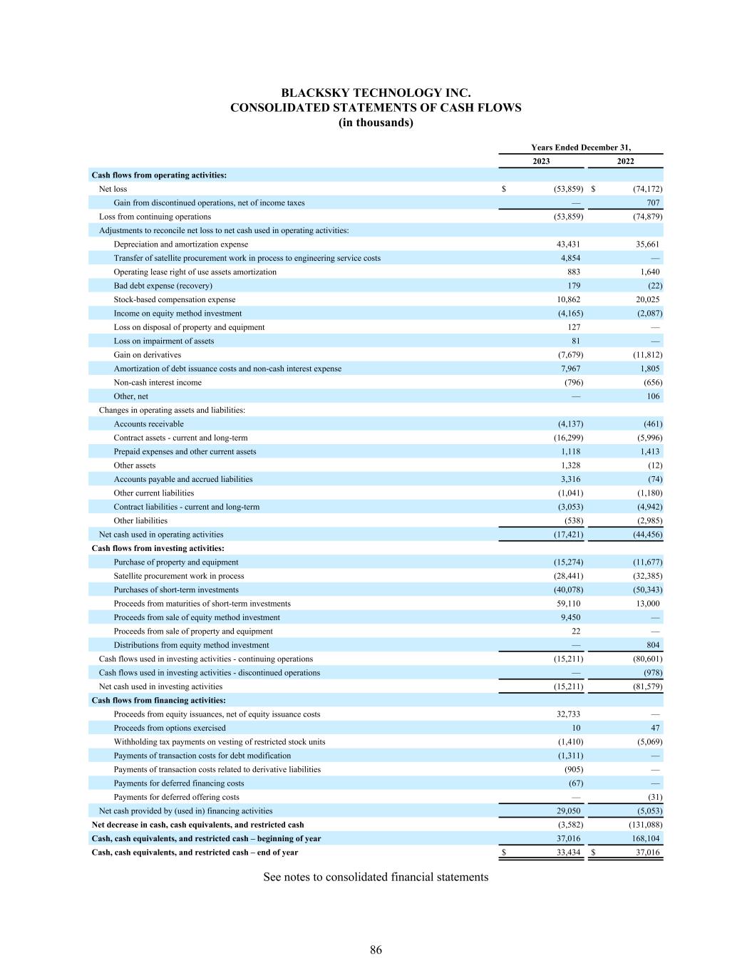 BLACKSKY TECHNOLOGY INC. CONSOLIDATED STATEMENTS OF CASH FLOWS (in thousands) Cash flows from operating activities: Net loss $ (53,859) $ (74,172) Gain from discontinued operations, net of income taxes — 707 Loss from continuing operations (53,859) (74,879) Adjustments to reconcile net loss to net cash used in operating activities: Depreciation and amortization expense 43,431 35,661 Transfer of satellite procurement work in process to engineering service costs 4,854 — Operating lease right of use assets amortization 883 1,640 Bad debt expense (recovery) 179 (22) Stock-based compensation expense 10,862 20,025 Income on equity method investment (4,165) (2,087) Loss on disposal of property and equipment 127 — Loss on impairment of assets 81 — Gain on derivatives (7,679) (11,812) Amortization of debt issuance costs and non-cash interest expense 7,967 1,805 Non-cash interest income (796) (656) Other, net — 106 Changes in operating assets and liabilities: Accounts receivable (4,137) (461) Contract assets - current and long-term (16,299) (5,996) Prepaid expenses and other current assets 1,118 1,413 Other assets 1,328 (12) Accounts payable and accrued liabilities 3,316 (74) Other current liabilities (1,041) (1,180) Contract liabilities - current and long-term (3,053) (4,942) Other liabilities (538) (2,985) Net cash used in operating activities (17,421) (44,456) Cash flows from investing activities: Purchase of property and equipment (15,274) (11,677) Satellite procurement work in process (28,441) (32,385) Purchases of short-term investments (40,078) (50,343) Proceeds from maturities of short-term investments 59,110 13,000 Proceeds from sale of equity method investment 9,450 — Proceeds from sale of property and equipment 22 — Distributions from equity method investment — 804 Cash flows used in investing activities - continuing operations (15,211) (80,601) Cash flows used in investing activities - discontinued operations — (978) Net cash used in investing activities (15,211) (81,579) Cash flows from financing activities: Proceeds from equity issuances, net of equity issuance costs 32,733 — Proceeds from options exercised 10 47 Withholding tax payments on vesting of restricted stock units (1,410) (5,069) Payments of transaction costs for debt modification (1,311) — Payments of transaction costs related to derivative liabilities (905) — Payments for deferred financing costs (67) — Payments for deferred offering costs — (31) Net cash provided by (used in) financing activities 29,050 (5,053) Net decrease in cash, cash equivalents, and restricted cash (3,582) (131,088) Cash, cash equivalents, and restricted cash – beginning of year 37,016 168,104 Cash, cash equivalents, and restricted cash – end of year $ 33,434 $ 37,016 Years Ended December 31, 2023 2022 See notes to consolidated financial statements 86