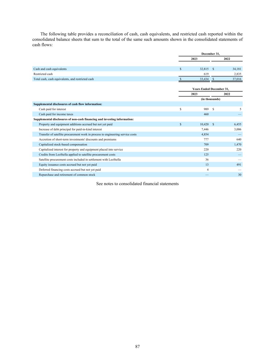 The following table provides a reconciliation of cash, cash equivalents, and restricted cash reported within the consolidated balance sheets that sum to the total of the same such amounts shown in the consolidated statements of cash flows: December 31, 2023 2022 Cash and cash equivalents $ 32,815 $ 34,181 Restricted cash 619 2,835 Total cash, cash equivalents, and restricted cash $ 33,434 $ 37,016 Years Ended December 31, 2023 2022 (in thousands) Supplemental disclosures of cash flow information: Cash paid for interest $ 989 $ 5 Cash paid for income taxes 460 — Supplemental disclosures of non-cash financing and investing information: Property and equipment additions accrued but not yet paid $ 10,420 $ 6,455 Increase of debt principal for paid-in-kind interest 7,446 3,006 Transfer of satellite procurement work in process to engineering service costs 4,854 — Accretion of short-term investments' discounts and premiums 777 640 Capitalized stock-based compensation 709 1,470 Capitalized interest for property and equipment placed into service 220 220 Credits from LeoStella applied to satellite procurement costs 125 — Satellite procurement costs included in settlement with LeoStella 36 — Equity issuance costs accrued but not yet paid 13 491 Deferred financing costs accrued but not yet paid 4 — Repurchase and retirement of common stock — 30 See notes to consolidated financial statements 87