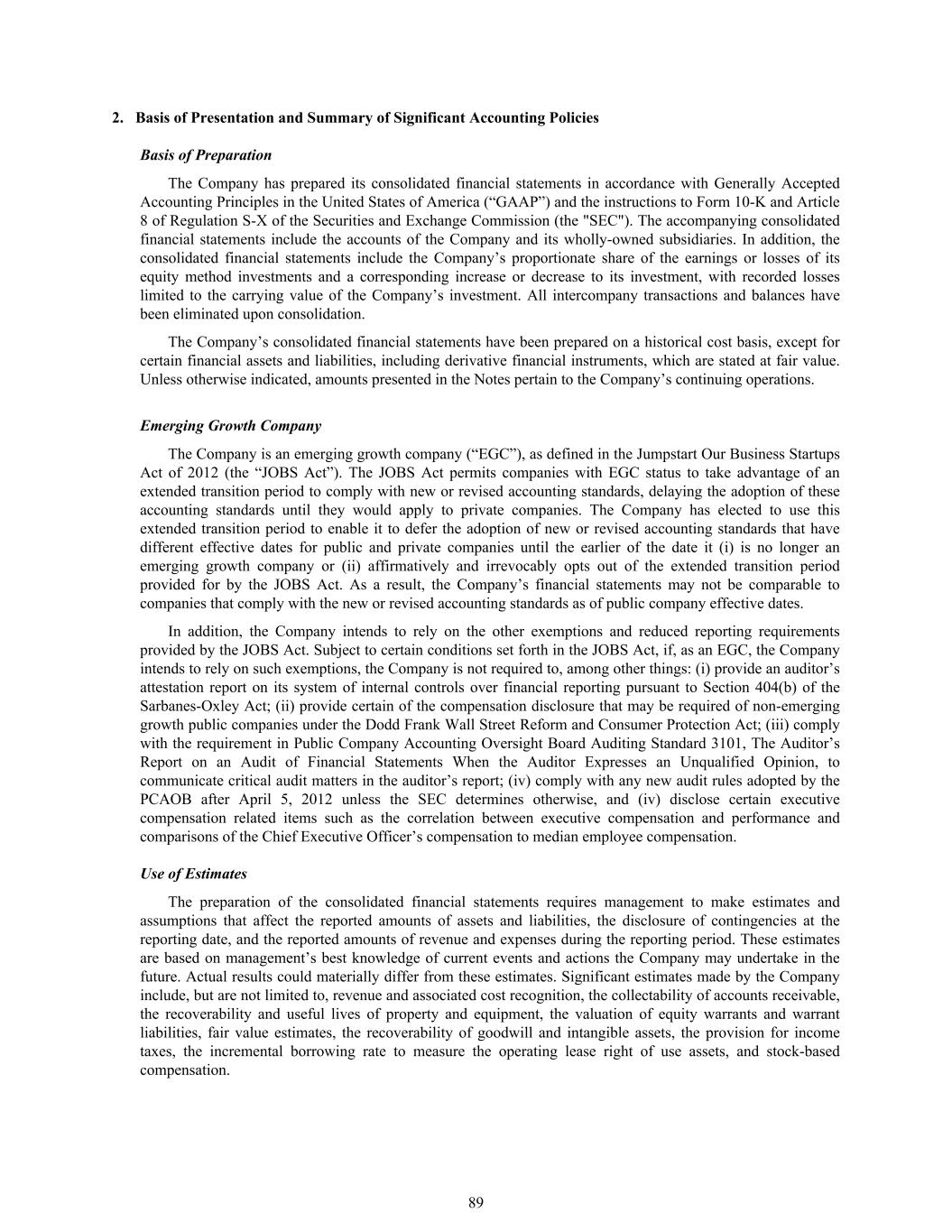2. Basis of Presentation and Summary of Significant Accounting Policies Basis of Preparation The Company has prepared its consolidated financial statements in accordance with Generally Accepted Accounting Principles in the United States of America (“GAAP”) and the instructions to Form 10-K and Article 8 of Regulation S-X of the Securities and Exchange Commission (the "SEC"). The accompanying consolidated financial statements include the accounts of the Company and its wholly-owned subsidiaries. In addition, the consolidated financial statements include the Company’s proportionate share of the earnings or losses of its equity method investments and a corresponding increase or decrease to its investment, with recorded losses limited to the carrying value of the Company’s investment. All intercompany transactions and balances have been eliminated upon consolidation. The Company’s consolidated financial statements have been prepared on a historical cost basis, except for certain financial assets and liabilities, including derivative financial instruments, which are stated at fair value. Unless otherwise indicated, amounts presented in the Notes pertain to the Company’s continuing operations. Emerging Growth Company The Company is an emerging growth company (“EGC”), as defined in the Jumpstart Our Business Startups Act of 2012 (the “JOBS Act”). The JOBS Act permits companies with EGC status to take advantage of an extended transition period to comply with new or revised accounting standards, delaying the adoption of these accounting standards until they would apply to private companies. The Company has elected to use this extended transition period to enable it to defer the adoption of new or revised accounting standards that have different effective dates for public and private companies until the earlier of the date it (i) is no longer an emerging growth company or (ii) affirmatively and irrevocably opts out of the extended transition period provided for by the JOBS Act. As a result, the Company’s financial statements may not be comparable to companies that comply with the new or revised accounting standards as of public company effective dates. In addition, the Company intends to rely on the other exemptions and reduced reporting requirements provided by the JOBS Act. Subject to certain conditions set forth in the JOBS Act, if, as an EGC, the Company intends to rely on such exemptions, the Company is not required to, among other things: (i) provide an auditor’s attestation report on its system of internal controls over financial reporting pursuant to Section 404(b) of the Sarbanes-Oxley Act; (ii) provide certain of the compensation disclosure that may be required of non-emerging growth public companies under the Dodd Frank Wall Street Reform and Consumer Protection Act; (iii) comply with the requirement in Public Company Accounting Oversight Board Auditing Standard 3101, The Auditor’s Report on an Audit of Financial Statements When the Auditor Expresses an Unqualified Opinion, to communicate critical audit matters in the auditor’s report; (iv) comply with any new audit rules adopted by the PCAOB after April 5, 2012 unless the SEC determines otherwise, and (iv) disclose certain executive compensation related items such as the correlation between executive compensation and performance and comparisons of the Chief Executive Officer’s compensation to median employee compensation. Use of Estimates The preparation of the consolidated financial statements requires management to make estimates and assumptions that affect the reported amounts of assets and liabilities, the disclosure of contingencies at the reporting date, and the reported amounts of revenue and expenses during the reporting period. These estimates are based on management’s best knowledge of current events and actions the Company may undertake in the future. Actual results could materially differ from these estimates. Significant estimates made by the Company include, but are not limited to, revenue and associated cost recognition, the collectability of accounts receivable, the recoverability and useful lives of property and equipment, the valuation of equity warrants and warrant liabilities, fair value estimates, the recoverability of goodwill and intangible assets, the provision for income taxes, the incremental borrowing rate to measure the operating lease right of use assets, and stock-based compensation. 89