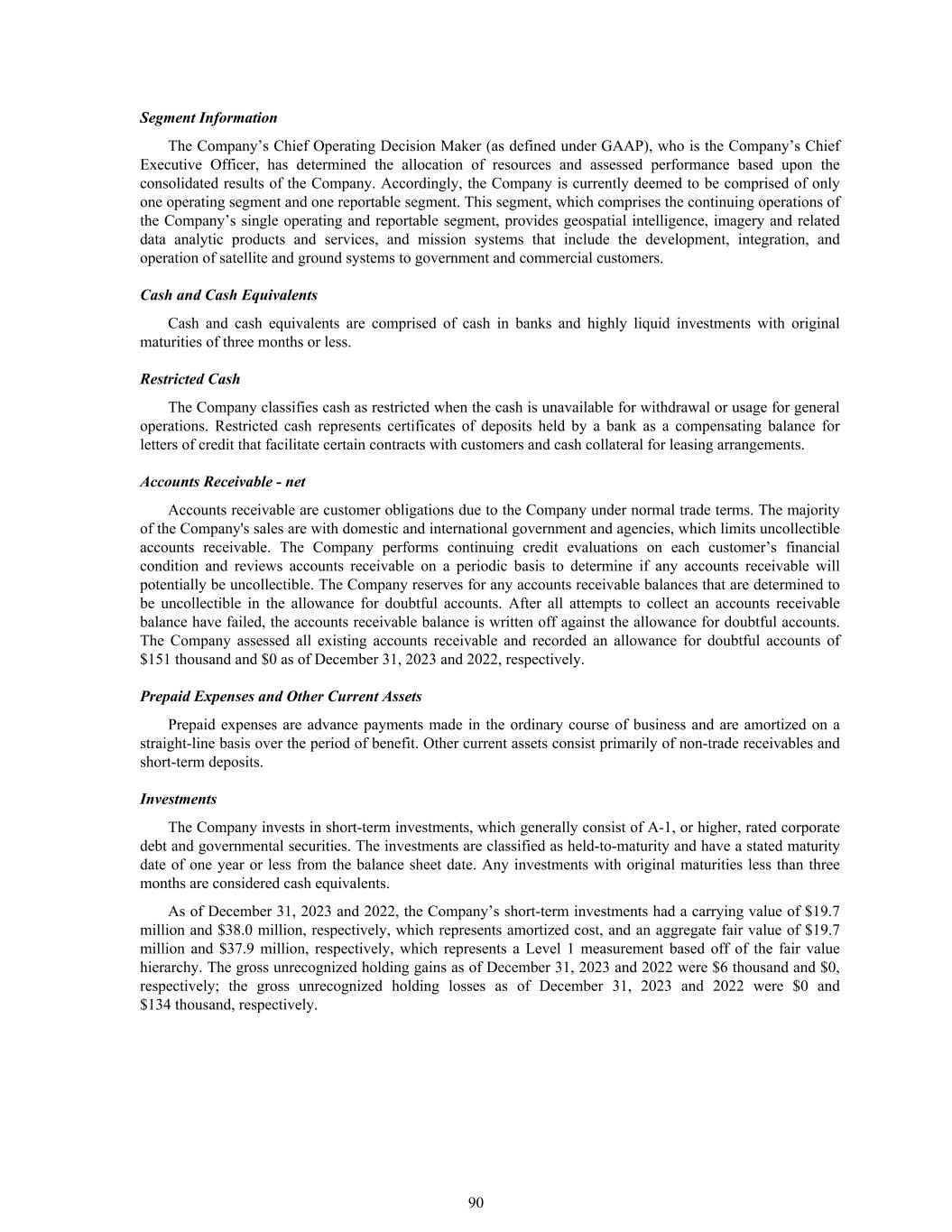 Segment Information The Company’s Chief Operating Decision Maker (as defined under GAAP), who is the Company’s Chief Executive Officer, has determined the allocation of resources and assessed performance based upon the consolidated results of the Company. Accordingly, the Company is currently deemed to be comprised of only one operating segment and one reportable segment. This segment, which comprises the continuing operations of the Company’s single operating and reportable segment, provides geospatial intelligence, imagery and related data analytic products and services, and mission systems that include the development, integration, and operation of satellite and ground systems to government and commercial customers. Cash and Cash Equivalents Cash and cash equivalents are comprised of cash in banks and highly liquid investments with original maturities of three months or less. Restricted Cash The Company classifies cash as restricted when the cash is unavailable for withdrawal or usage for general operations. Restricted cash represents certificates of deposits held by a bank as a compensating balance for letters of credit that facilitate certain contracts with customers and cash collateral for leasing arrangements. Accounts Receivable - net Accounts receivable are customer obligations due to the Company under normal trade terms. The majority of the Company's sales are with domestic and international government and agencies, which limits uncollectible accounts receivable. The Company performs continuing credit evaluations on each customer’s financial condition and reviews accounts receivable on a periodic basis to determine if any accounts receivable will potentially be uncollectible. The Company reserves for any accounts receivable balances that are determined to be uncollectible in the allowance for doubtful accounts. After all attempts to collect an accounts receivable balance have failed, the accounts receivable balance is written off against the allowance for doubtful accounts. The Company assessed all existing accounts receivable and recorded an allowance for doubtful accounts of $151 thousand and $0 as of December 31, 2023 and 2022, respectively. Prepaid Expenses and Other Current Assets Prepaid expenses are advance payments made in the ordinary course of business and are amortized on a straight-line basis over the period of benefit. Other current assets consist primarily of non-trade receivables and short-term deposits. Investments The Company invests in short-term investments, which generally consist of A-1, or higher, rated corporate debt and governmental securities. The investments are classified as held-to-maturity and have a stated maturity date of one year or less from the balance sheet date. Any investments with original maturities less than three months are considered cash equivalents. As of December 31, 2023 and 2022, the Company’s short-term investments had a carrying value of $19.7 million and $38.0 million, respectively, which represents amortized cost, and an aggregate fair value of $19.7 million and $37.9 million, respectively, which represents a Level 1 measurement based off of the fair value hierarchy. The gross unrecognized holding gains as of December 31, 2023 and 2022 were $6 thousand and $0, respectively; the gross unrecognized holding losses as of December 31, 2023 and 2022 were $0 and $134 thousand, respectively. 90