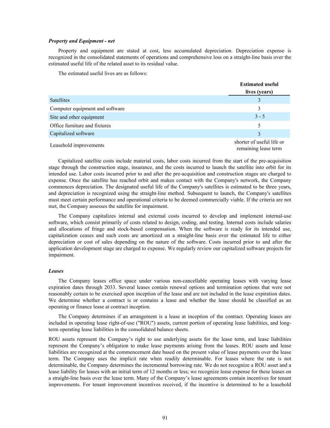 Property and Equipment - net Property and equipment are stated at cost, less accumulated depreciation. Depreciation expense is recognized in the consolidated statements of operations and comprehensive loss on a straight-line basis over the estimated useful life of the related asset to its residual value. The estimated useful lives are as follows: Estimated useful lives (years) Satellites 3 Computer equipment and software 3 Site and other equipment 3 - 5 Office furniture and fixtures 5 Capitalized software 3 Leasehold improvements shorter of useful life or remaining lease term Capitalized satellite costs include material costs, labor costs incurred from the start of the pre-acquisition stage through the construction stage, insurance, and the costs incurred to launch the satellite into orbit for its intended use. Labor costs incurred prior to and after the pre-acquisition and construction stages are charged to expense. Once the satellite has reached orbit and makes contact with the Company's network, the Company commences depreciation. The designated useful life of the Company's satellites is estimated to be three years, and depreciation is recognized using the straight-line method. Subsequent to launch, the Company's satellites must meet certain performance and operational criteria to be deemed commercially viable. If the criteria are not met, the Company assesses the satellite for impairment. The Company capitalizes internal and external costs incurred to develop and implement internal-use software, which consist primarily of costs related to design, coding, and testing. Internal costs include salaries and allocations of fringe and stock-based compensation. When the software is ready for its intended use, capitalization ceases and such costs are amortized on a straight-line basis over the estimated life to either depreciation or cost of sales depending on the nature of the software. Costs incurred prior to and after the application development stage are charged to expense. We regularly review our capitalized software projects for impairment. Leases The Company leases office space under various non-cancellable operating leases with varying lease expiration dates through 2033. Several leases contain renewal options and termination options that were not reasonably certain to be exercised upon inception of the lease and are not included in the lease expiration dates. We determine whether a contract is or contains a lease and whether the lease should be classified as an operating or finance lease at contract inception. The Company determines if an arrangement is a lease at inception of the contract. Operating leases are included in operating lease right-of-use ("ROU") assets, current portion of operating lease liabilities, and long- term operating lease liabilities in the consolidated balance sheets. ROU assets represent the Company’s right to use underlying assets for the lease term, and lease liabilities represent the Company’s obligation to make lease payments arising from the leases. ROU assets and lease liabilities are recognized at the commencement date based on the present value of lease payments over the lease term. The Company uses the implicit rate when readily determinable. For leases where the rate is not determinable, the Company determines the incremental borrowing rate. We do not recognize a ROU asset and a lease liability for leases with an initial term of 12 months or less; we recognize lease expense for these leases on a straight-line basis over the lease term. Many of the Company’s lease agreements contain incentives for tenant improvements. For tenant improvement incentives received, if the incentive is determined to be a leasehold 91