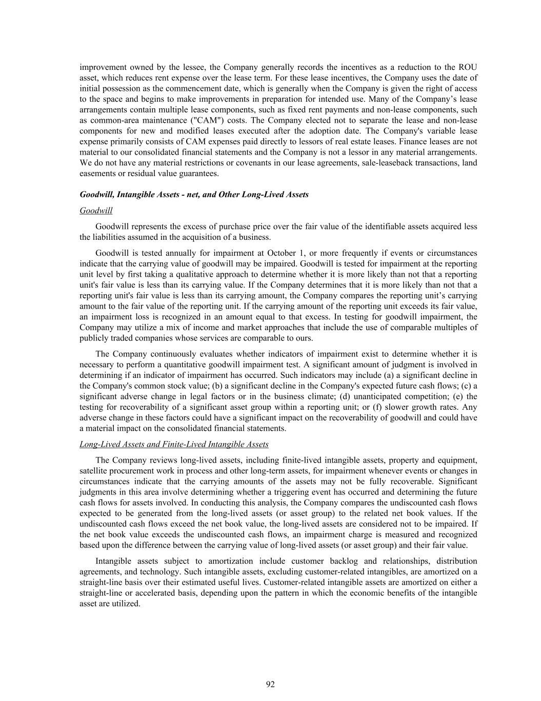 improvement owned by the lessee, the Company generally records the incentives as a reduction to the ROU asset, which reduces rent expense over the lease term. For these lease incentives, the Company uses the date of initial possession as the commencement date, which is generally when the Company is given the right of access to the space and begins to make improvements in preparation for intended use. Many of the Company’s lease arrangements contain multiple lease components, such as fixed rent payments and non-lease components, such as common-area maintenance ("CAM") costs. The Company elected not to separate the lease and non-lease components for new and modified leases executed after the adoption date. The Company's variable lease expense primarily consists of CAM expenses paid directly to lessors of real estate leases. Finance leases are not material to our consolidated financial statements and the Company is not a lessor in any material arrangements. We do not have any material restrictions or covenants in our lease agreements, sale-leaseback transactions, land easements or residual value guarantees. Goodwill, Intangible Assets - net, and Other Long-Lived Assets Goodwill Goodwill represents the excess of purchase price over the fair value of the identifiable assets acquired less the liabilities assumed in the acquisition of a business. Goodwill is tested annually for impairment at October 1, or more frequently if events or circumstances indicate that the carrying value of goodwill may be impaired. Goodwill is tested for impairment at the reporting unit level by first taking a qualitative approach to determine whether it is more likely than not that a reporting unit's fair value is less than its carrying value. If the Company determines that it is more likely than not that a reporting unit's fair value is less than its carrying amount, the Company compares the reporting unit’s carrying amount to the fair value of the reporting unit. If the carrying amount of the reporting unit exceeds its fair value, an impairment loss is recognized in an amount equal to that excess. In testing for goodwill impairment, the Company may utilize a mix of income and market approaches that include the use of comparable multiples of publicly traded companies whose services are comparable to ours. The Company continuously evaluates whether indicators of impairment exist to determine whether it is necessary to perform a quantitative goodwill impairment test. A significant amount of judgment is involved in determining if an indicator of impairment has occurred. Such indicators may include (a) a significant decline in the Company's common stock value; (b) a significant decline in the Company's expected future cash flows; (c) a significant adverse change in legal factors or in the business climate; (d) unanticipated competition; (e) the testing for recoverability of a significant asset group within a reporting unit; or (f) slower growth rates. Any adverse change in these factors could have a significant impact on the recoverability of goodwill and could have a material impact on the consolidated financial statements. Long-Lived Assets and Finite-Lived Intangible Assets The Company reviews long-lived assets, including finite-lived intangible assets, property and equipment, satellite procurement work in process and other long-term assets, for impairment whenever events or changes in circumstances indicate that the carrying amounts of the assets may not be fully recoverable. Significant judgments in this area involve determining whether a triggering event has occurred and determining the future cash flows for assets involved. In conducting this analysis, the Company compares the undiscounted cash flows expected to be generated from the long-lived assets (or asset group) to the related net book values. If the undiscounted cash flows exceed the net book value, the long-lived assets are considered not to be impaired. If the net book value exceeds the undiscounted cash flows, an impairment charge is measured and recognized based upon the difference between the carrying value of long-lived assets (or asset group) and their fair value. Intangible assets subject to amortization include customer backlog and relationships, distribution agreements, and technology. Such intangible assets, excluding customer-related intangibles, are amortized on a straight-line basis over their estimated useful lives. Customer-related intangible assets are amortized on either a straight-line or accelerated basis, depending upon the pattern in which the economic benefits of the intangible asset are utilized. 92