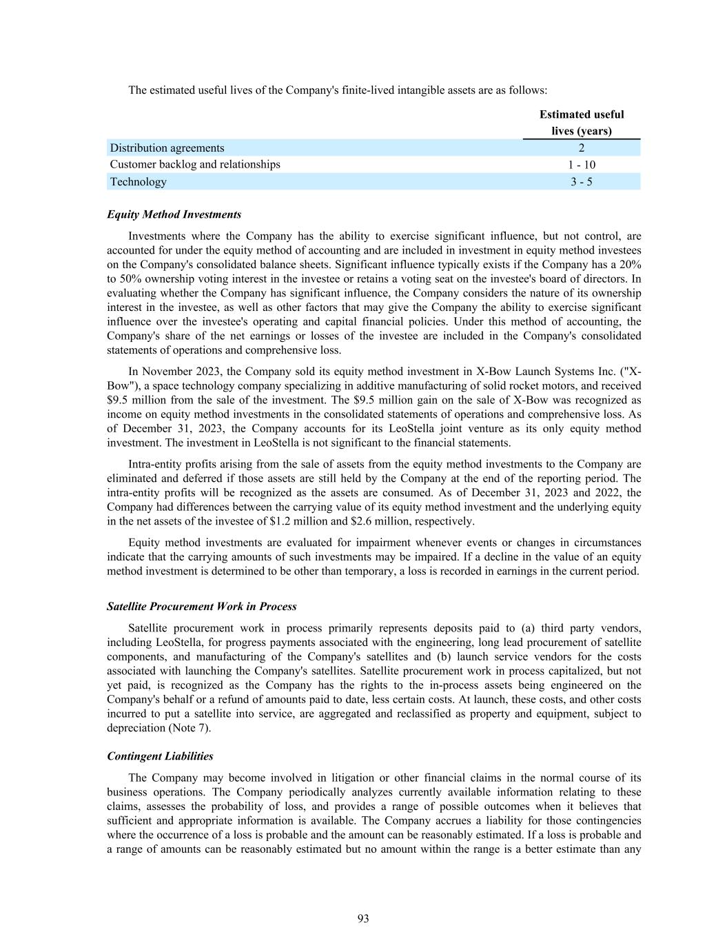 The estimated useful lives of the Company's finite-lived intangible assets are as follows: Estimated useful lives (years) Distribution agreements 2 Customer backlog and relationships 1 - 10 Technology 3 - 5 Equity Method Investments Investments where the Company has the ability to exercise significant influence, but not control, are accounted for under the equity method of accounting and are included in investment in equity method investees on the Company's consolidated balance sheets. Significant influence typically exists if the Company has a 20% to 50% ownership voting interest in the investee or retains a voting seat on the investee's board of directors. In evaluating whether the Company has significant influence, the Company considers the nature of its ownership interest in the investee, as well as other factors that may give the Company the ability to exercise significant influence over the investee's operating and capital financial policies. Under this method of accounting, the Company's share of the net earnings or losses of the investee are included in the Company's consolidated statements of operations and comprehensive loss. In November 2023, the Company sold its equity method investment in X-Bow Launch Systems Inc. ("X- Bow"), a space technology company specializing in additive manufacturing of solid rocket motors, and received $9.5 million from the sale of the investment. The $9.5 million gain on the sale of X-Bow was recognized as income on equity method investments in the consolidated statements of operations and comprehensive loss. As of December 31, 2023, the Company accounts for its LeoStella joint venture as its only equity method investment. The investment in LeoStella is not significant to the financial statements. Intra-entity profits arising from the sale of assets from the equity method investments to the Company are eliminated and deferred if those assets are still held by the Company at the end of the reporting period. The intra-entity profits will be recognized as the assets are consumed. As of December 31, 2023 and 2022, the Company had differences between the carrying value of its equity method investment and the underlying equity in the net assets of the investee of $1.2 million and $2.6 million, respectively. Equity method investments are evaluated for impairment whenever events or changes in circumstances indicate that the carrying amounts of such investments may be impaired. If a decline in the value of an equity method investment is determined to be other than temporary, a loss is recorded in earnings in the current period. Satellite Procurement Work in Process Satellite procurement work in process primarily represents deposits paid to (a) third party vendors, including LeoStella, for progress payments associated with the engineering, long lead procurement of satellite components, and manufacturing of the Company's satellites and (b) launch service vendors for the costs associated with launching the Company's satellites. Satellite procurement work in process capitalized, but not yet paid, is recognized as the Company has the rights to the in-process assets being engineered on the Company's behalf or a refund of amounts paid to date, less certain costs. At launch, these costs, and other costs incurred to put a satellite into service, are aggregated and reclassified as property and equipment, subject to depreciation (Note 7). Contingent Liabilities The Company may become involved in litigation or other financial claims in the normal course of its business operations. The Company periodically analyzes currently available information relating to these claims, assesses the probability of loss, and provides a range of possible outcomes when it believes that sufficient and appropriate information is available. The Company accrues a liability for those contingencies where the occurrence of a loss is probable and the amount can be reasonably estimated. If a loss is probable and a range of amounts can be reasonably estimated but no amount within the range is a better estimate than any 93