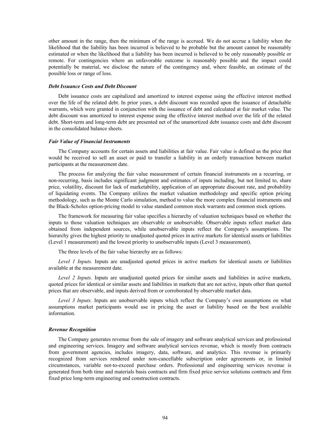 other amount in the range, then the minimum of the range is accrued. We do not accrue a liability when the likelihood that the liability has been incurred is believed to be probable but the amount cannot be reasonably estimated or when the likelihood that a liability has been incurred is believed to be only reasonably possible or remote. For contingencies where an unfavorable outcome is reasonably possible and the impact could potentially be material, we disclose the nature of the contingency and, where feasible, an estimate of the possible loss or range of loss. Debt Issuance Costs and Debt Discount Debt issuance costs are capitalized and amortized to interest expense using the effective interest method over the life of the related debt. In prior years, a debt discount was recorded upon the issuance of detachable warrants, which were granted in conjunction with the issuance of debt and calculated at fair market value. The debt discount was amortized to interest expense using the effective interest method over the life of the related debt. Short-term and long-term debt are presented net of the unamortized debt issuance costs and debt discount in the consolidated balance sheets. Fair Value of Financial Instruments The Company accounts for certain assets and liabilities at fair value. Fair value is defined as the price that would be received to sell an asset or paid to transfer a liability in an orderly transaction between market participants at the measurement date. The process for analyzing the fair value measurement of certain financial instruments on a recurring, or non-recurring, basis includes significant judgment and estimates of inputs including, but not limited to, share price, volatility, discount for lack of marketability, application of an appropriate discount rate, and probability of liquidating events. The Company utilizes the market valuation methodology and specific option pricing methodology, such as the Monte Carlo simulation, method to value the more complex financial instruments and the Black-Scholes option-pricing model to value standard common stock warrants and common stock options. The framework for measuring fair value specifies a hierarchy of valuation techniques based on whether the inputs to those valuation techniques are observable or unobservable. Observable inputs reflect market data obtained from independent sources, while unobservable inputs reflect the Company's assumptions. The hierarchy gives the highest priority to unadjusted quoted prices in active markets for identical assets or liabilities (Level 1 measurement) and the lowest priority to unobservable inputs (Level 3 measurement). The three levels of the fair value hierarchy are as follows: Level 1 Inputs. Inputs are unadjusted quoted prices in active markets for identical assets or liabilities available at the measurement date. Level 2 Inputs. Inputs are unadjusted quoted prices for similar assets and liabilities in active markets, quoted prices for identical or similar assets and liabilities in markets that are not active, inputs other than quoted prices that are observable, and inputs derived from or corroborated by observable market data. Level 3 Inputs. Inputs are unobservable inputs which reflect the Company’s own assumptions on what assumptions market participants would use in pricing the asset or liability based on the best available information. Revenue Recognition The Company generates revenue from the sale of imagery and software analytical services and professional and engineering services. Imagery and software analytical services revenue, which is mostly from contracts from government agencies, includes imagery, data, software, and analytics. This revenue is primarily recognized from services rendered under non-cancellable subscription order agreements or, in limited circumstances, variable not-to-exceed purchase orders. Professional and engineering services revenue is generated from both time and materials basis contracts and firm fixed price service solutions contracts and firm fixed price long-term engineering and construction contracts. 94