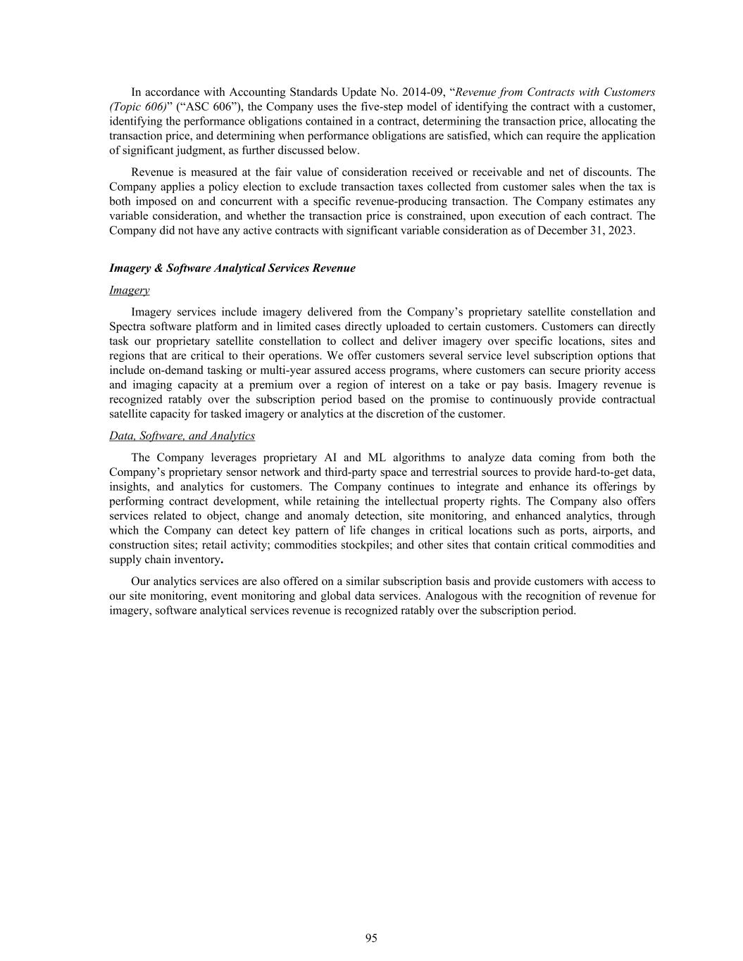 In accordance with Accounting Standards Update No. 2014-09, “Revenue from Contracts with Customers (Topic 606)” (“ASC 606”), the Company uses the five-step model of identifying the contract with a customer, identifying the performance obligations contained in a contract, determining the transaction price, allocating the transaction price, and determining when performance obligations are satisfied, which can require the application of significant judgment, as further discussed below. Revenue is measured at the fair value of consideration received or receivable and net of discounts. The Company applies a policy election to exclude transaction taxes collected from customer sales when the tax is both imposed on and concurrent with a specific revenue-producing transaction. The Company estimates any variable consideration, and whether the transaction price is constrained, upon execution of each contract. The Company did not have any active contracts with significant variable consideration as of December 31, 2023. Imagery & Software Analytical Services Revenue Imagery Imagery services include imagery delivered from the Company’s proprietary satellite constellation and Spectra software platform and in limited cases directly uploaded to certain customers. Customers can directly task our proprietary satellite constellation to collect and deliver imagery over specific locations, sites and regions that are critical to their operations. We offer customers several service level subscription options that include on-demand tasking or multi-year assured access programs, where customers can secure priority access and imaging capacity at a premium over a region of interest on a take or pay basis. Imagery revenue is recognized ratably over the subscription period based on the promise to continuously provide contractual satellite capacity for tasked imagery or analytics at the discretion of the customer. Data, Software, and Analytics The Company leverages proprietary AI and ML algorithms to analyze data coming from both the Company’s proprietary sensor network and third-party space and terrestrial sources to provide hard-to-get data, insights, and analytics for customers. The Company continues to integrate and enhance its offerings by performing contract development, while retaining the intellectual property rights. The Company also offers services related to object, change and anomaly detection, site monitoring, and enhanced analytics, through which the Company can detect key pattern of life changes in critical locations such as ports, airports, and construction sites; retail activity; commodities stockpiles; and other sites that contain critical commodities and supply chain inventory. Our analytics services are also offered on a similar subscription basis and provide customers with access to our site monitoring, event monitoring and global data services. Analogous with the recognition of revenue for imagery, software analytical services revenue is recognized ratably over the subscription period. 95