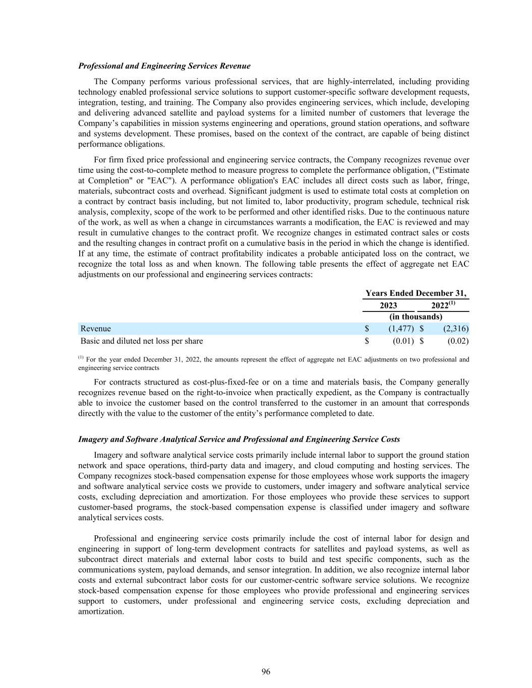 Professional and Engineering Services Revenue The Company performs various professional services, that are highly-interrelated, including providing technology enabled professional service solutions to support customer-specific software development requests, integration, testing, and training. The Company also provides engineering services, which include, developing and delivering advanced satellite and payload systems for a limited number of customers that leverage the Company’s capabilities in mission systems engineering and operations, ground station operations, and software and systems development. These promises, based on the context of the contract, are capable of being distinct performance obligations. For firm fixed price professional and engineering service contracts, the Company recognizes revenue over time using the cost-to-complete method to measure progress to complete the performance obligation, ("Estimate at Completion" or "EAC"). A performance obligation's EAC includes all direct costs such as labor, fringe, materials, subcontract costs and overhead. Significant judgment is used to estimate total costs at completion on a contract by contract basis including, but not limited to, labor productivity, program schedule, technical risk analysis, complexity, scope of the work to be performed and other identified risks. Due to the continuous nature of the work, as well as when a change in circumstances warrants a modification, the EAC is reviewed and may result in cumulative changes to the contract profit. We recognize changes in estimated contract sales or costs and the resulting changes in contract profit on a cumulative basis in the period in which the change is identified. If at any time, the estimate of contract profitability indicates a probable anticipated loss on the contract, we recognize the total loss as and when known. The following table presents the effect of aggregate net EAC adjustments on our professional and engineering services contracts: Years Ended December 31, 2023 2022(1) (in thousands) Revenue $ (1,477) $ (2,316) Basic and diluted net loss per share $ (0.01) $ (0.02) (1) For the year ended December 31, 2022, the amounts represent the effect of aggregate net EAC adjustments on two professional and engineering service contracts For contracts structured as cost-plus-fixed-fee or on a time and materials basis, the Company generally recognizes revenue based on the right-to-invoice when practically expedient, as the Company is contractually able to invoice the customer based on the control transferred to the customer in an amount that corresponds directly with the value to the customer of the entity’s performance completed to date. Imagery and Software Analytical Service and Professional and Engineering Service Costs Imagery and software analytical service costs primarily include internal labor to support the ground station network and space operations, third-party data and imagery, and cloud computing and hosting services. The Company recognizes stock-based compensation expense for those employees whose work supports the imagery and software analytical service costs we provide to customers, under imagery and software analytical service costs, excluding depreciation and amortization. For those employees who provide these services to support customer-based programs, the stock-based compensation expense is classified under imagery and software analytical services costs. Professional and engineering service costs primarily include the cost of internal labor for design and engineering in support of long-term development contracts for satellites and payload systems, as well as subcontract direct materials and external labor costs to build and test specific components, such as the communications system, payload demands, and sensor integration. In addition, we also recognize internal labor costs and external subcontract labor costs for our customer-centric software service solutions. We recognize stock-based compensation expense for those employees who provide professional and engineering services support to customers, under professional and engineering service costs, excluding depreciation and amortization. 96