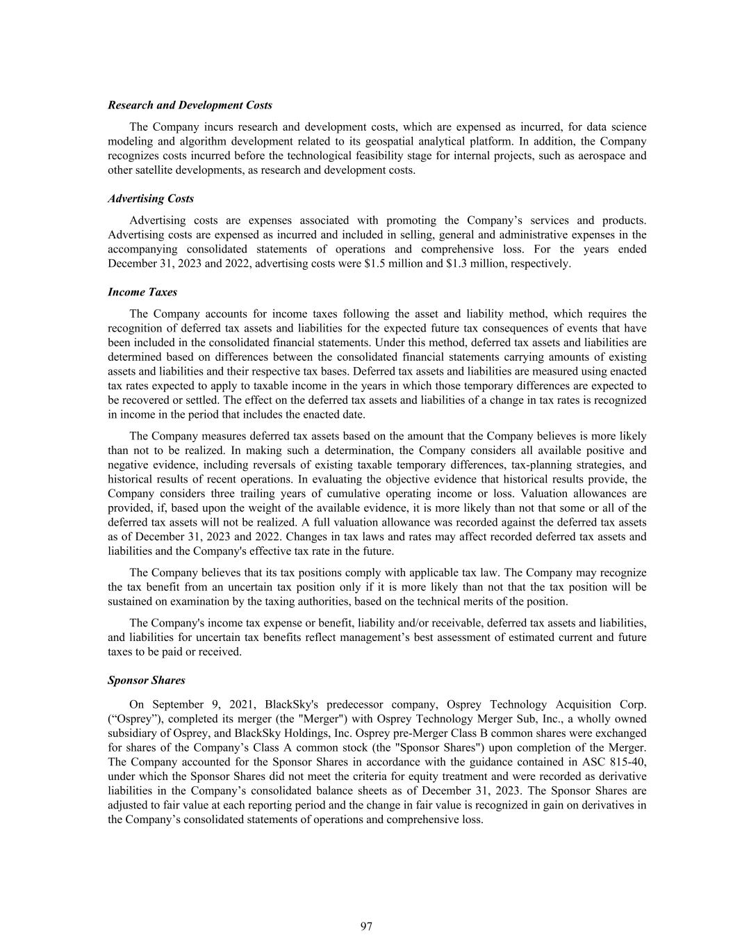 Research and Development Costs The Company incurs research and development costs, which are expensed as incurred, for data science modeling and algorithm development related to its geospatial analytical platform. In addition, the Company recognizes costs incurred before the technological feasibility stage for internal projects, such as aerospace and other satellite developments, as research and development costs. Advertising Costs Advertising costs are expenses associated with promoting the Company’s services and products. Advertising costs are expensed as incurred and included in selling, general and administrative expenses in the accompanying consolidated statements of operations and comprehensive loss. For the years ended December 31, 2023 and 2022, advertising costs were $1.5 million and $1.3 million, respectively. Income Taxes The Company accounts for income taxes following the asset and liability method, which requires the recognition of deferred tax assets and liabilities for the expected future tax consequences of events that have been included in the consolidated financial statements. Under this method, deferred tax assets and liabilities are determined based on differences between the consolidated financial statements carrying amounts of existing assets and liabilities and their respective tax bases. Deferred tax assets and liabilities are measured using enacted tax rates expected to apply to taxable income in the years in which those temporary differences are expected to be recovered or settled. The effect on the deferred tax assets and liabilities of a change in tax rates is recognized in income in the period that includes the enacted date. The Company measures deferred tax assets based on the amount that the Company believes is more likely than not to be realized. In making such a determination, the Company considers all available positive and negative evidence, including reversals of existing taxable temporary differences, tax-planning strategies, and historical results of recent operations. In evaluating the objective evidence that historical results provide, the Company considers three trailing years of cumulative operating income or loss. Valuation allowances are provided, if, based upon the weight of the available evidence, it is more likely than not that some or all of the deferred tax assets will not be realized. A full valuation allowance was recorded against the deferred tax assets as of December 31, 2023 and 2022. Changes in tax laws and rates may affect recorded deferred tax assets and liabilities and the Company's effective tax rate in the future. The Company believes that its tax positions comply with applicable tax law. The Company may recognize the tax benefit from an uncertain tax position only if it is more likely than not that the tax position will be sustained on examination by the taxing authorities, based on the technical merits of the position. The Company's income tax expense or benefit, liability and/or receivable, deferred tax assets and liabilities, and liabilities for uncertain tax benefits reflect management’s best assessment of estimated current and future taxes to be paid or received. Sponsor Shares On September 9, 2021, BlackSky's predecessor company, Osprey Technology Acquisition Corp. (“Osprey”), completed its merger (the "Merger") with Osprey Technology Merger Sub, Inc., a wholly owned subsidiary of Osprey, and BlackSky Holdings, Inc. Osprey pre-Merger Class B common shares were exchanged for shares of the Company’s Class A common stock (the "Sponsor Shares") upon completion of the Merger. The Company accounted for the Sponsor Shares in accordance with the guidance contained in ASC 815-40, under which the Sponsor Shares did not meet the criteria for equity treatment and were recorded as derivative liabilities in the Company’s consolidated balance sheets as of December 31, 2023. The Sponsor Shares are adjusted to fair value at each reporting period and the change in fair value is recognized in gain on derivatives in the Company’s consolidated statements of operations and comprehensive loss. 97