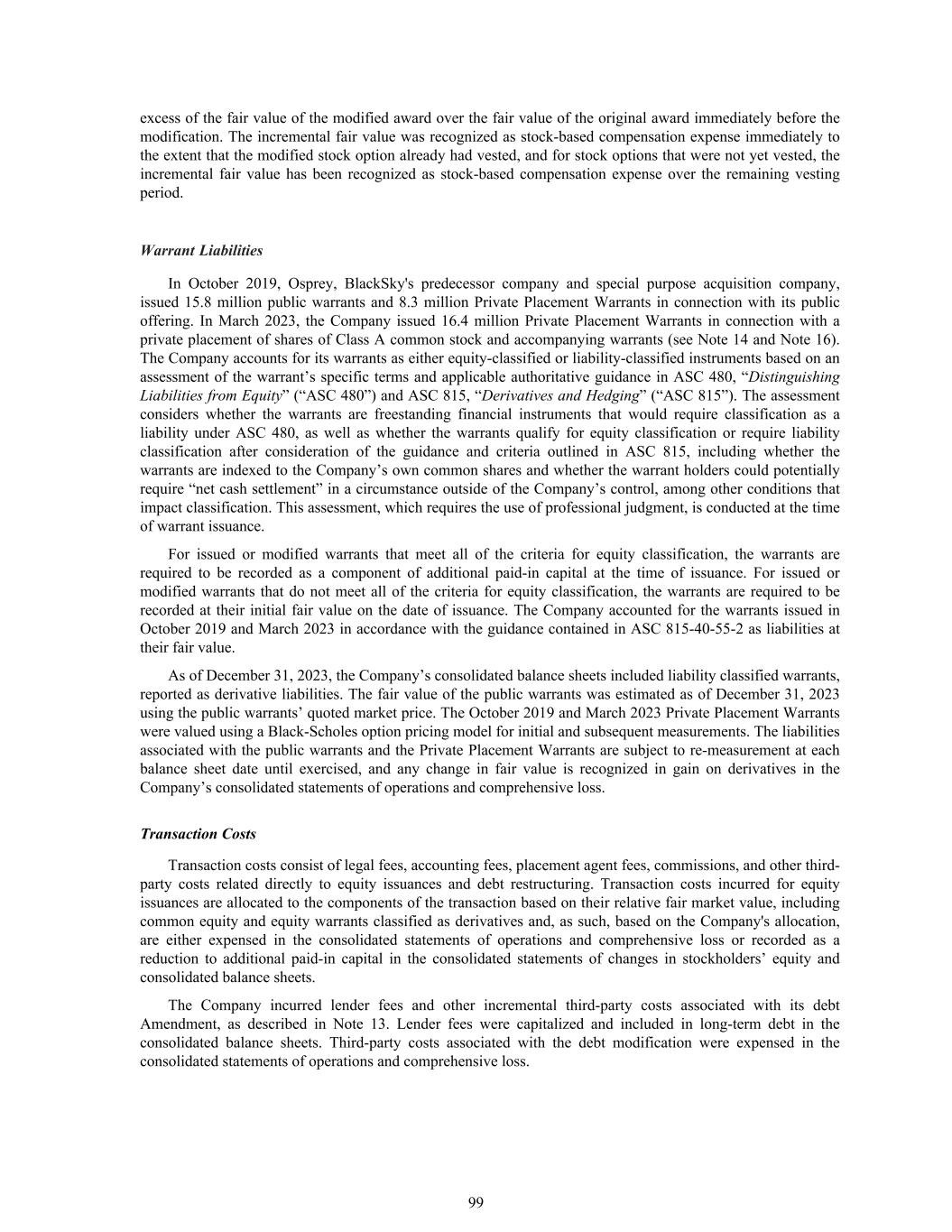 excess of the fair value of the modified award over the fair value of the original award immediately before the modification. The incremental fair value was recognized as stock-based compensation expense immediately to the extent that the modified stock option already had vested, and for stock options that were not yet vested, the incremental fair value has been recognized as stock-based compensation expense over the remaining vesting period. Warrant Liabilities In October 2019, Osprey, BlackSky's predecessor company and special purpose acquisition company, issued 15.8 million public warrants and 8.3 million Private Placement Warrants in connection with its public offering. In March 2023, the Company issued 16.4 million Private Placement Warrants in connection with a private placement of shares of Class A common stock and accompanying warrants (see Note 14 and Note 16). The Company accounts for its warrants as either equity-classified or liability-classified instruments based on an assessment of the warrant’s specific terms and applicable authoritative guidance in ASC 480, “Distinguishing Liabilities from Equity” (“ASC 480”) and ASC 815, “Derivatives and Hedging” (“ASC 815”). The assessment considers whether the warrants are freestanding financial instruments that would require classification as a liability under ASC 480, as well as whether the warrants qualify for equity classification or require liability classification after consideration of the guidance and criteria outlined in ASC 815, including whether the warrants are indexed to the Company’s own common shares and whether the warrant holders could potentially require “net cash settlement” in a circumstance outside of the Company’s control, among other conditions that impact classification. This assessment, which requires the use of professional judgment, is conducted at the time of warrant issuance. For issued or modified warrants that meet all of the criteria for equity classification, the warrants are required to be recorded as a component of additional paid-in capital at the time of issuance. For issued or modified warrants that do not meet all of the criteria for equity classification, the warrants are required to be recorded at their initial fair value on the date of issuance. The Company accounted for the warrants issued in October 2019 and March 2023 in accordance with the guidance contained in ASC 815-40-55-2 as liabilities at their fair value. As of December 31, 2023, the Company’s consolidated balance sheets included liability classified warrants, reported as derivative liabilities. The fair value of the public warrants was estimated as of December 31, 2023 using the public warrants’ quoted market price. The October 2019 and March 2023 Private Placement Warrants were valued using a Black-Scholes option pricing model for initial and subsequent measurements. The liabilities associated with the public warrants and the Private Placement Warrants are subject to re-measurement at each balance sheet date until exercised, and any change in fair value is recognized in gain on derivatives in the Company’s consolidated statements of operations and comprehensive loss. Transaction Costs Transaction costs consist of legal fees, accounting fees, placement agent fees, commissions, and other third- party costs related directly to equity issuances and debt restructuring. Transaction costs incurred for equity issuances are allocated to the components of the transaction based on their relative fair market value, including common equity and equity warrants classified as derivatives and, as such, based on the Company's allocation, are either expensed in the consolidated statements of operations and comprehensive loss or recorded as a reduction to additional paid-in capital in the consolidated statements of changes in stockholders’ equity and consolidated balance sheets. The Company incurred lender fees and other incremental third-party costs associated with its debt Amendment, as described in Note 13. Lender fees were capitalized and included in long-term debt in the consolidated balance sheets. Third-party costs associated with the debt modification were expensed in the consolidated statements of operations and comprehensive loss. 99