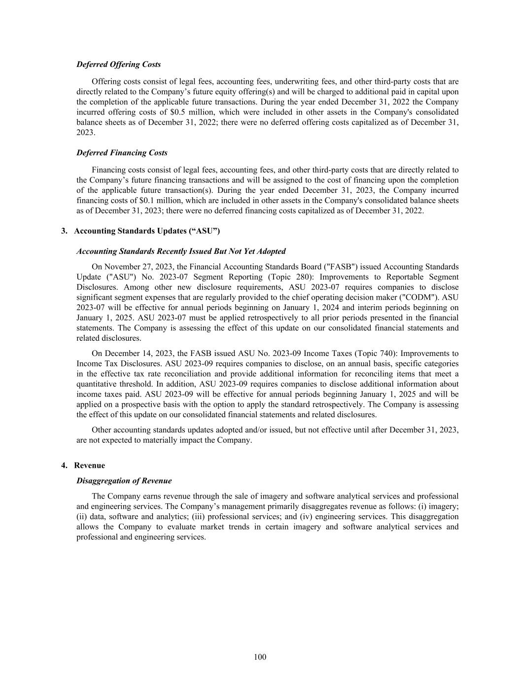 Deferred Offering Costs Offering costs consist of legal fees, accounting fees, underwriting fees, and other third-party costs that are directly related to the Company’s future equity offering(s) and will be charged to additional paid in capital upon the completion of the applicable future transactions. During the year ended December 31, 2022 the Company incurred offering costs of $0.5 million, which were included in other assets in the Company's consolidated balance sheets as of December 31, 2022; there were no deferred offering costs capitalized as of December 31, 2023. Deferred Financing Costs Financing costs consist of legal fees, accounting fees, and other third-party costs that are directly related to the Company’s future financing transactions and will be assigned to the cost of financing upon the completion of the applicable future transaction(s). During the year ended December 31, 2023, the Company incurred financing costs of $0.1 million, which are included in other assets in the Company's consolidated balance sheets as of December 31, 2023; there were no deferred financing costs capitalized as of December 31, 2022. 3. Accounting Standards Updates (“ASU”) Accounting Standards Recently Issued But Not Yet Adopted On November 27, 2023, the Financial Accounting Standards Board ("FASB") issued Accounting Standards Update ("ASU") No. 2023-07 Segment Reporting (Topic 280): Improvements to Reportable Segment Disclosures. Among other new disclosure requirements, ASU 2023-07 requires companies to disclose significant segment expenses that are regularly provided to the chief operating decision maker ("CODM"). ASU 2023-07 will be effective for annual periods beginning on January 1, 2024 and interim periods beginning on January 1, 2025. ASU 2023-07 must be applied retrospectively to all prior periods presented in the financial statements. The Company is assessing the effect of this update on our consolidated financial statements and related disclosures. On December 14, 2023, the FASB issued ASU No. 2023-09 Income Taxes (Topic 740): Improvements to Income Tax Disclosures. ASU 2023-09 requires companies to disclose, on an annual basis, specific categories in the effective tax rate reconciliation and provide additional information for reconciling items that meet a quantitative threshold. In addition, ASU 2023-09 requires companies to disclose additional information about income taxes paid. ASU 2023-09 will be effective for annual periods beginning January 1, 2025 and will be applied on a prospective basis with the option to apply the standard retrospectively. The Company is assessing the effect of this update on our consolidated financial statements and related disclosures. Other accounting standards updates adopted and/or issued, but not effective until after December 31, 2023, are not expected to materially impact the Company. 4. Revenue Disaggregation of Revenue The Company earns revenue through the sale of imagery and software analytical services and professional and engineering services. The Company’s management primarily disaggregates revenue as follows: (i) imagery; (ii) data, software and analytics; (iii) professional services; and (iv) engineering services. This disaggregation allows the Company to evaluate market trends in certain imagery and software analytical services and professional and engineering services. 100