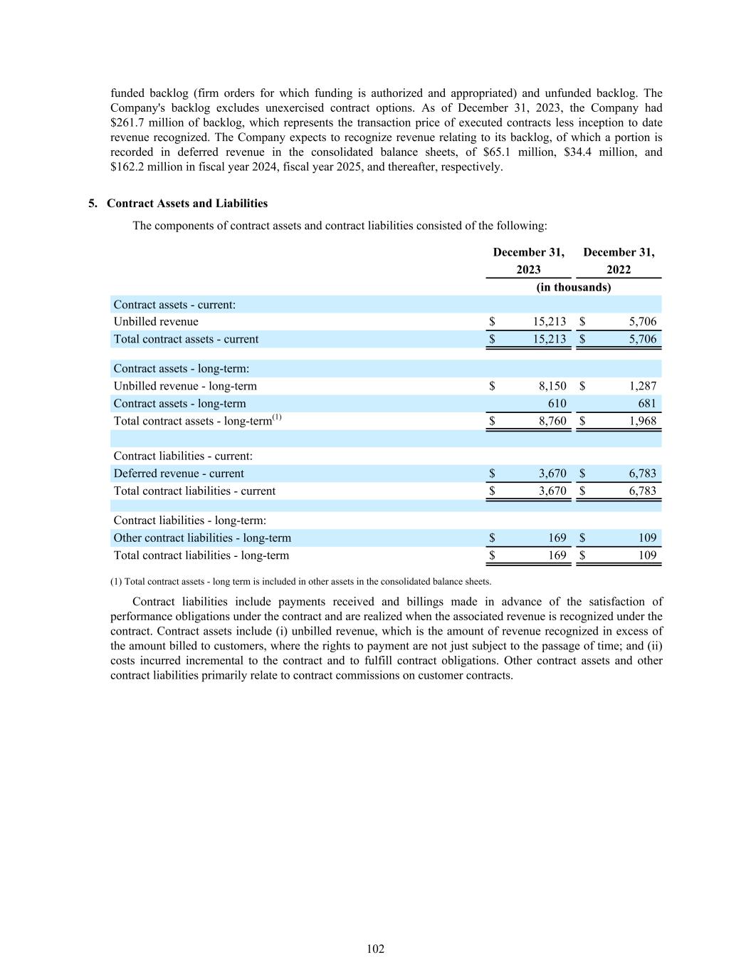 funded backlog (firm orders for which funding is authorized and appropriated) and unfunded backlog. The Company's backlog excludes unexercised contract options. As of December 31, 2023, the Company had $261.7 million of backlog, which represents the transaction price of executed contracts less inception to date revenue recognized. The Company expects to recognize revenue relating to its backlog, of which a portion is recorded in deferred revenue in the consolidated balance sheets, of $65.1 million, $34.4 million, and $162.2 million in fiscal year 2024, fiscal year 2025, and thereafter, respectively. 5. Contract Assets and Liabilities The components of contract assets and contract liabilities consisted of the following: December 31, December 31, 2023 2022 (in thousands) Contract assets - current: Unbilled revenue $ 15,213 $ 5,706 Total contract assets - current $ 15,213 $ 5,706 Contract assets - long-term: Unbilled revenue - long-term $ 8,150 $ 1,287 Contract assets - long-term 610 681 Total contract assets - long-term(1) $ 8,760 $ 1,968 Contract liabilities - current: Deferred revenue - current $ 3,670 $ 6,783 Total contract liabilities - current $ 3,670 $ 6,783 Contract liabilities - long-term: Other contract liabilities - long-term $ 169 $ 109 Total contract liabilities - long-term $ 169 $ 109 (1) Total contract assets - long term is included in other assets in the consolidated balance sheets. Contract liabilities include payments received and billings made in advance of the satisfaction of performance obligations under the contract and are realized when the associated revenue is recognized under the contract. Contract assets include (i) unbilled revenue, which is the amount of revenue recognized in excess of the amount billed to customers, where the rights to payment are not just subject to the passage of time; and (ii) costs incurred incremental to the contract and to fulfill contract obligations. Other contract assets and other contract liabilities primarily relate to contract commissions on customer contracts. 102