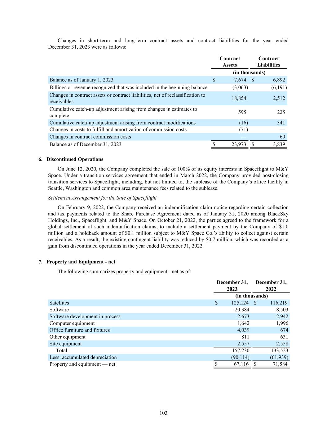 Changes in short-term and long-term contract assets and contract liabilities for the year ended December 31, 2023 were as follows: Contract Assets Contract Liabilities (in thousands) Balance as of January 1, 2023 $ 7,674 $ 6,892 Billings or revenue recognized that was included in the beginning balance (3,063) (6,191) Changes in contract assets or contract liabilities, net of reclassification to receivables 18,854 2,512 Cumulative catch-up adjustment arising from changes in estimates to complete 595 225 Cumulative catch-up adjustment arising from contract modifications (16) 341 Changes in costs to fulfill and amortization of commission costs (71) — Changes in contract commission costs — 60 Balance as of December 31, 2023 $ 23,973 $ 3,839 6. Discontinued Operations On June 12, 2020, the Company completed the sale of 100% of its equity interests in Spaceflight to M&Y Space. Under a transition services agreement that ended in March 2022, the Company provided post-closing transition services to Spaceflight, including, but not limited to, the sublease of the Company’s office facility in Seattle, Washington and common area maintenance fees related to the sublease. Settlement Arrangement for the Sale of Spaceflight On February 9, 2022, the Company received an indemnification claim notice regarding certain collection and tax payments related to the Share Purchase Agreement dated as of January 31, 2020 among BlackSky Holdings, Inc., Spaceflight, and M&Y Space. On October 21, 2022, the parties agreed to the framework for a global settlement of such indemnification claims, to include a settlement payment by the Company of $1.0 million and a holdback amount of $0.1 million subject to M&Y Space Co.’s ability to collect against certain receivables. As a result, the existing contingent liability was reduced by $0.7 million, which was recorded as a gain from discontinued operations in the year ended December 31, 2022. 7. Property and Equipment - net The following summarizes property and equipment - net as of: December 31, December 31, 2023 2022 (in thousands) Satellites $ 125,124 $ 116,219 Software 20,384 8,503 Software development in process 2,673 2,942 Computer equipment 1,642 1,996 Office furniture and fixtures 4,039 674 Other equipment 811 631 Site equipment 2,557 2,558 Total 157,230 133,523 Less: accumulated depreciation (90,114) (61,939) Property and equipment — net $ 67,116 $ 71,584 103