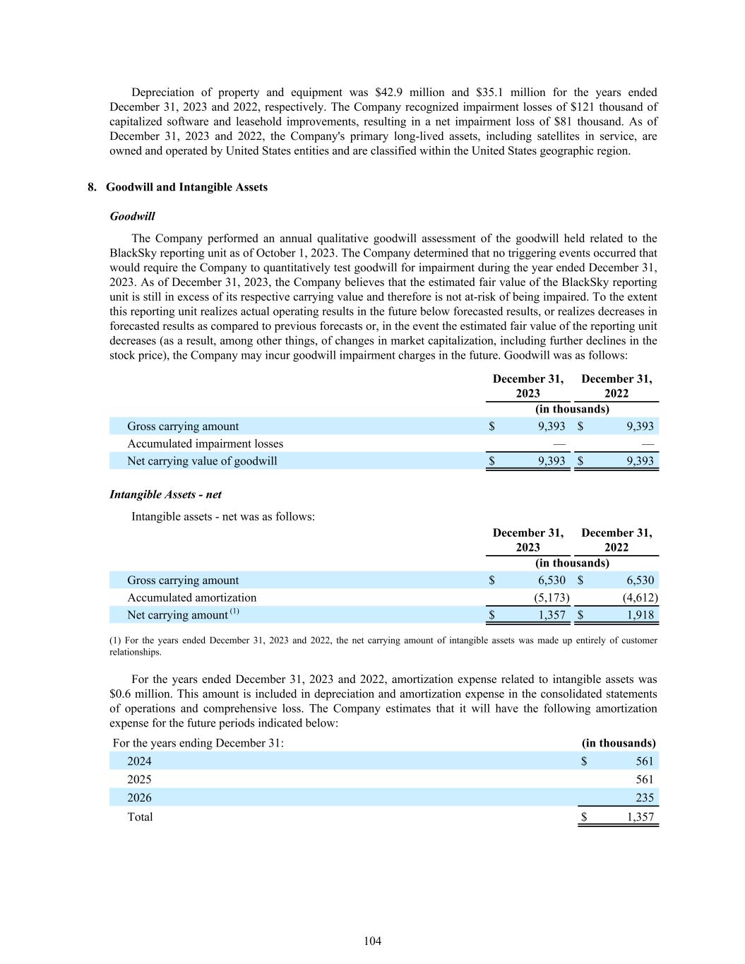 Depreciation of property and equipment was $42.9 million and $35.1 million for the years ended December 31, 2023 and 2022, respectively. The Company recognized impairment losses of $121 thousand of capitalized software and leasehold improvements, resulting in a net impairment loss of $81 thousand. As of December 31, 2023 and 2022, the Company's primary long-lived assets, including satellites in service, are owned and operated by United States entities and are classified within the United States geographic region. 8. Goodwill and Intangible Assets Goodwill The Company performed an annual qualitative goodwill assessment of the goodwill held related to the BlackSky reporting unit as of October 1, 2023. The Company determined that no triggering events occurred that would require the Company to quantitatively test goodwill for impairment during the year ended December 31, 2023. As of December 31, 2023, the Company believes that the estimated fair value of the BlackSky reporting unit is still in excess of its respective carrying value and therefore is not at-risk of being impaired. To the extent this reporting unit realizes actual operating results in the future below forecasted results, or realizes decreases in forecasted results as compared to previous forecasts or, in the event the estimated fair value of the reporting unit decreases (as a result, among other things, of changes in market capitalization, including further declines in the stock price), the Company may incur goodwill impairment charges in the future. Goodwill was as follows: December 31, 2023 December 31, 2022 (in thousands) Gross carrying amount $ 9,393 $ 9,393 Accumulated impairment losses — — Net carrying value of goodwill $ 9,393 $ 9,393 Intangible Assets - net Intangible assets - net was as follows: December 31, 2023 December 31, 2022 (in thousands) Gross carrying amount $ 6,530 $ 6,530 Accumulated amortization (5,173) (4,612) Net carrying amount (1) $ 1,357 $ 1,918 (1) For the years ended December 31, 2023 and 2022, the net carrying amount of intangible assets was made up entirely of customer relationships. For the years ended December 31, 2023 and 2022, amortization expense related to intangible assets was $0.6 million. This amount is included in depreciation and amortization expense in the consolidated statements of operations and comprehensive loss. The Company estimates that it will have the following amortization expense for the future periods indicated below: For the years ending December 31: (in thousands) 2024 $ 561 2025 561 2026 235 Total $ 1,357 104