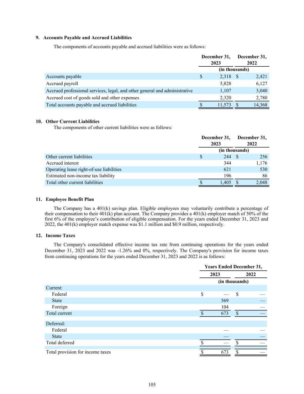 9. Accounts Payable and Accrued Liabilities The components of accounts payable and accrued liabilities were as follows: December 31, December 31, 2023 2022 (in thousands) Accounts payable $ 2,318 $ 2,421 Accrued payroll 5,828 6,127 Accrued professional services, legal, and other general and administrative 1,107 3,040 Accrued cost of goods sold and other expenses 2,320 2,780 Total accounts payable and accrued liabilities $ 11,573 $ 14,368 10. Other Current Liabilities The components of other current liabilities were as follows: December 31, December 31, 2023 2022 (in thousands) Other current liabilities $ 244 $ 256 Accrued interest 344 1,176 Operating lease right-of-use liabilities 621 530 Estimated non-income tax liability 196 86 Total other current liabilities $ 1,405 $ 2,048 11. Employee Benefit Plan The Company has a 401(k) savings plan. Eligible employees may voluntarily contribute a percentage of their compensation to their 401(k) plan account. The Company provides a 401(k) employer match of 50% of the first 6% of the employee’s contribution of eligible compensation. For the years ended December 31, 2023 and 2022, the 401(k) employer match expense was $1.1 million and $0.9 million, respectively. 12. Income Taxes The Company's consolidated effective income tax rate from continuing operations for the years ended December 31, 2023 and 2022 was -1.26% and 0%, respectively. The Company's provision for income taxes from continuing operations for the years ended December 31, 2023 and 2022 is as follows: Years Ended December 31, 2023 2022 (in thousands) Current: Federal $ — $ — State 569 — Foreign 104 — Total current $ 673 $ — Deferred: Federal — — State — — Total deferred $ — $ — Total provision for income taxes $ 673 $ — 105
