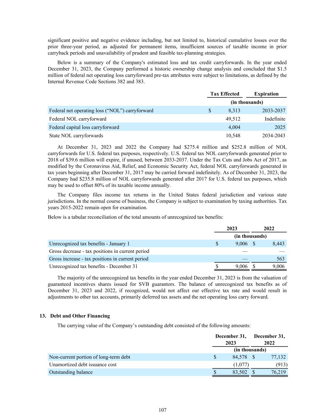 significant positive and negative evidence including, but not limited to, historical cumulative losses over the prior three-year period, as adjusted for permanent items, insufficient sources of taxable income in prior carryback periods and unavailability of prudent and feasible tax-planning strategies. Below is a summary of the Company's estimated loss and tax credit carryforwards. In the year ended December 31, 2023, the Company performed a historic ownership change analysis and concluded that $1.5 million of federal net operating loss carryforward pre-tax attributes were subject to limitations, as defined by the Internal Revenue Code Sections 382 and 383. Tax Effected Expiration (in thousands) Federal net operating loss (“NOL”) carryforward $ 8,313 2033-2037 Federal NOL carryforward 49,512 Indefinite Federal capital loss carryforward 4,004 2025 State NOL carryforwards 10,548 2034-2043 At December 31, 2023 and 2022 the Company had $275.4 million and $252.8 million of NOL carryforwards for U.S. federal tax purposes, respectively. U.S. federal tax NOL carryforwards generated prior to 2018 of $39.6 million will expire, if unused, between 2033-2037. Under the Tax Cuts and Jobs Act of 2017, as modified by the Coronavirus Aid, Relief, and Economic Security Act, federal NOL carryforwards generated in tax years beginning after December 31, 2017 may be carried forward indefinitely. As of December 31, 2023, the Company had $235.8 million of NOL carryforwards generated after 2017 for U.S. federal tax purposes, which may be used to offset 80% of its taxable income annually. The Company files income tax returns in the United States federal jurisdiction and various state jurisdictions. In the normal course of business, the Company is subject to examination by taxing authorities. Tax years 2015-2022 remain open for examination. Below is a tabular reconciliation of the total amounts of unrecognized tax benefits: 2023 2022 (in thousands) Unrecognized tax benefits - January 1 $ 9,006 $ 8,443 Gross decrease - tax positions in current period — — Gross increase - tax positions in current period — 563 Unrecognized tax benefits - December 31 $ 9,006 $ 9,006 The majority of the unrecognized tax benefits in the year ended December 31, 2023 is from the valuation of guaranteed incentives shares issued for SVB guarantors. The balance of unrecognized tax benefits as of December 31, 2023 and 2022, if recognized, would not affect our effective tax rate and would result in adjustments to other tax accounts, primarily deferred tax assets and the net operating loss carry forward. 13. Debt and Other Financing The carrying value of the Company’s outstanding debt consisted of the following amounts: December 31, December 31, 2023 2022 (in thousands) Non-current portion of long-term debt $ 84,578 $ 77,132 Unamortized debt issuance cost (1,077) (913) Outstanding balance $ 83,502 $ 76,219 107