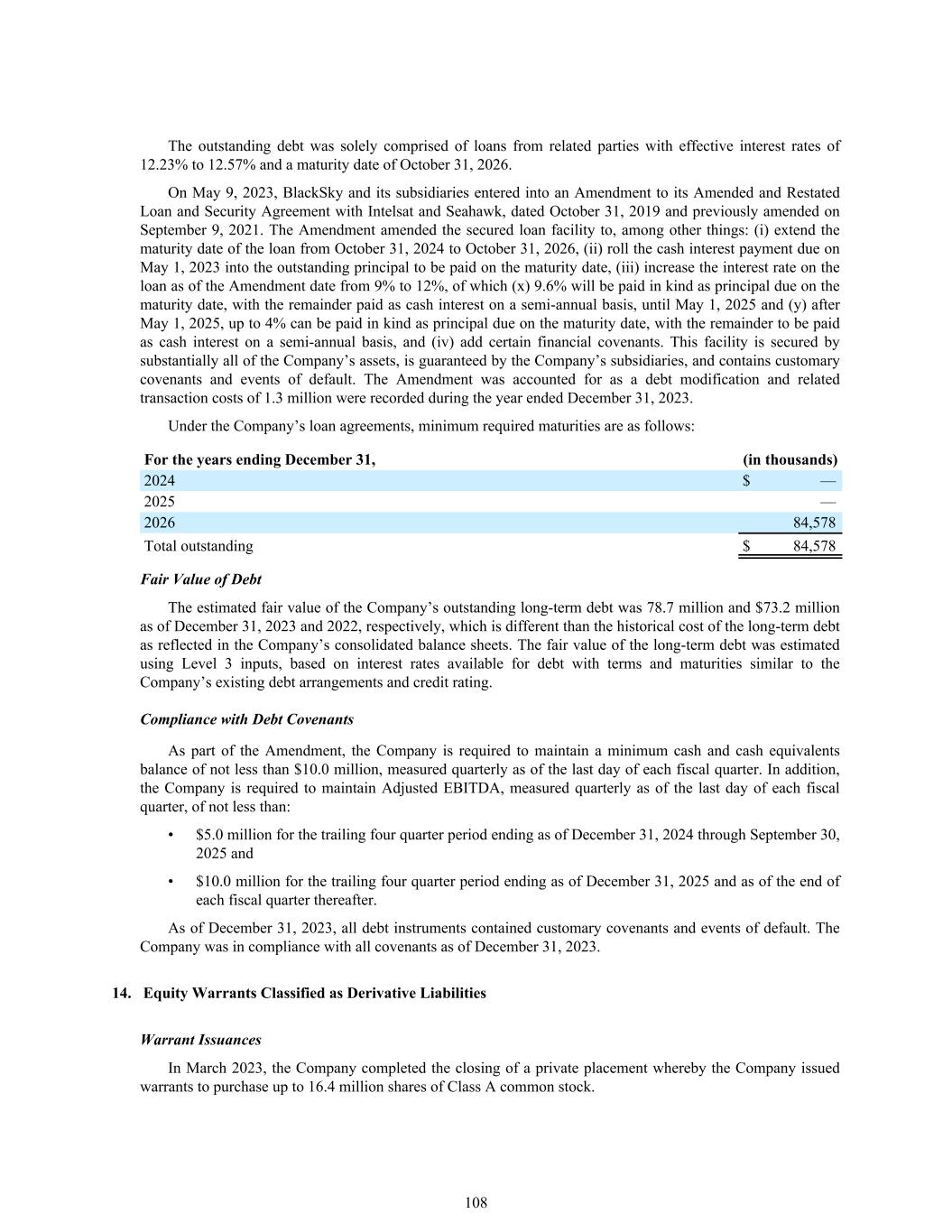 The outstanding debt was solely comprised of loans from related parties with effective interest rates of 12.23% to 12.57% and a maturity date of October 31, 2026. On May 9, 2023, BlackSky and its subsidiaries entered into an Amendment to its Amended and Restated Loan and Security Agreement with Intelsat and Seahawk, dated October 31, 2019 and previously amended on September 9, 2021. The Amendment amended the secured loan facility to, among other things: (i) extend the maturity date of the loan from October 31, 2024 to October 31, 2026, (ii) roll the cash interest payment due on May 1, 2023 into the outstanding principal to be paid on the maturity date, (iii) increase the interest rate on the loan as of the Amendment date from 9% to 12%, of which (x) 9.6% will be paid in kind as principal due on the maturity date, with the remainder paid as cash interest on a semi-annual basis, until May 1, 2025 and (y) after May 1, 2025, up to 4% can be paid in kind as principal due on the maturity date, with the remainder to be paid as cash interest on a semi-annual basis, and (iv) add certain financial covenants. This facility is secured by substantially all of the Company’s assets, is guaranteed by the Company’s subsidiaries, and contains customary covenants and events of default. The Amendment was accounted for as a debt modification and related transaction costs of 1.3 million were recorded during the year ended December 31, 2023. Under the Company’s loan agreements, minimum required maturities are as follows: For the years ending December 31, (in thousands) 2024 $ — 2025 — 2026 84,578 Total outstanding $ 84,578 Fair Value of Debt The estimated fair value of the Company’s outstanding long-term debt was 78.7 million and $73.2 million as of December 31, 2023 and 2022, respectively, which is different than the historical cost of the long-term debt as reflected in the Company’s consolidated balance sheets. The fair value of the long-term debt was estimated using Level 3 inputs, based on interest rates available for debt with terms and maturities similar to the Company’s existing debt arrangements and credit rating. Compliance with Debt Covenants As part of the Amendment, the Company is required to maintain a minimum cash and cash equivalents balance of not less than $10.0 million, measured quarterly as of the last day of each fiscal quarter. In addition, the Company is required to maintain Adjusted EBITDA, measured quarterly as of the last day of each fiscal quarter, of not less than: • $5.0 million for the trailing four quarter period ending as of December 31, 2024 through September 30, 2025 and • $10.0 million for the trailing four quarter period ending as of December 31, 2025 and as of the end of each fiscal quarter thereafter. As of December 31, 2023, all debt instruments contained customary covenants and events of default. The Company was in compliance with all covenants as of December 31, 2023. 14. Equity Warrants Classified as Derivative Liabilities Warrant Issuances In March 2023, the Company completed the closing of a private placement whereby the Company issued warrants to purchase up to 16.4 million shares of Class A common stock. 108