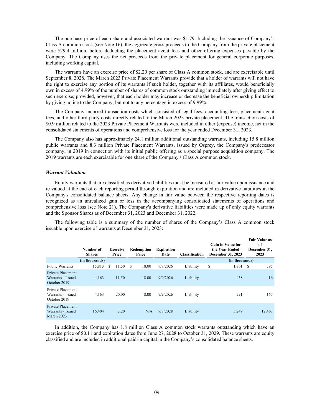 The purchase price of each share and associated warrant was $1.79. Including the issuance of Company’s Class A common stock (see Note 16), the aggregate gross proceeds to the Company from the private placement were $29.4 million, before deducting the placement agent fees and other offering expenses payable by the Company. The Company uses the net proceeds from the private placement for general corporate purposes, including working capital. The warrants have an exercise price of $2.20 per share of Class A common stock, and are exercisable until September 8, 2028. The March 2023 Private Placement Warrants provide that a holder of warrants will not have the right to exercise any portion of its warrants if such holder, together with its affiliates, would beneficially own in excess of 4.99% of the number of shares of common stock outstanding immediately after giving effect to such exercise; provided, however, that each holder may increase or decrease the beneficial ownership limitation by giving notice to the Company; but not to any percentage in excess of 9.99%. The Company incurred transaction costs which consisted of legal fees, accounting fees, placement agent fees, and other third-party costs directly related to the March 2023 private placement. The transaction costs of $0.9 million related to the 2023 Private Placement Warrants were included in other (expense) income, net in the consolidated statements of operations and comprehensive loss for the year ended December 31, 2023. The Company also has approximately 24.1 million additional outstanding warrants, including 15.8 million public warrants and 8.3 million Private Placement Warrants, issued by Osprey, the Company's predecessor company, in 2019 in connection with its initial public offering as a special purpose acquisition company. The 2019 warrants are each exercisable for one share of the Company's Class A common stock. Warrant Valuation Equity warrants that are classified as derivative liabilities must be measured at fair value upon issuance and re-valued at the end of each reporting period through expiration and are included in derivative liabilities in the Company's consolidated balance sheets. Any change in fair value between the respective reporting dates is recognized as an unrealized gain or loss in the accompanying consolidated statements of operations and comprehensive loss (see Note 21). The Company's derivative liabilities were made up of only equity warrants and the Sponsor Shares as of December 31, 2023 and December 31, 2022. The following table is a summary of the number of shares of the Company’s Class A common stock issuable upon exercise of warrants at December 31, 2023: Number of Shares Exercise Price Redemption Price Expiration Date Classification Gain in Value for the Year Ended December 31, 2023 Fair Value as of December 31, 2023 (in thousands) (in thousands) Public Warrants 15,813 $ 11.50 $ 18.00 9/9/2026 Liability $ 1,301 $ 795 Private Placement Warrants - Issued October 2019 4,163 11.50 18.00 9/9/2026 Liability 458 416 Private Placement Warrants - Issued October 2019 4,163 20.00 18.00 9/9/2026 Liability 291 167 Private Placement Warrants - Issued March 2023 16,404 2.20 N/A 9/8/2028 Liability 5,249 12,467 In addition, the Company has 1.8 million Class A common stock warrants outstanding which have an exercise price of $0.11 and expiration dates from June 27, 2028 to October 31, 2029. These warrants are equity classified and are included in additional paid-in capital in the Company’s consolidated balance sheets. 109