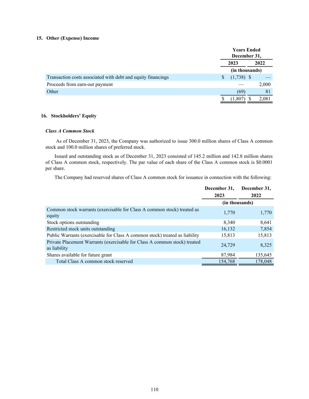 15. Other (Expense) Income Years Ended December 31, 2023 2022 (in thousands) Transaction costs associated with debt and equity financings $ (1,738) $ — Proceeds from earn-out payment — 2,000 Other (69) 81 $ (1,807) $ 2,081 16. Stockholders’ Equity Class A Common Stock As of December 31, 2023, the Company was authorized to issue 300.0 million shares of Class A common stock and 100.0 million shares of preferred stock. Issued and outstanding stock as of December 31, 2023 consisted of 145.2 million and 142.8 million shares of Class A common stock, respectively. The par value of each share of the Class A common stock is $0.0001 per share. The Company had reserved shares of Class A common stock for issuance in connection with the following: December 31, December 31, 2023 2022 (in thousands) Common stock warrants (exercisable for Class A common stock) treated as equity 1,770 1,770 Stock options outstanding 8,340 8,641 Restricted stock units outstanding 16,132 7,854 Public Warrants (exercisable for Class A common stock) treated as liability 15,813 15,813 Private Placement Warrants (exercisable for Class A common stock) treated as liability 24,729 8,325 Shares available for future grant 87,984 135,645 Total Class A common stock reserved 154,768 178,048 110