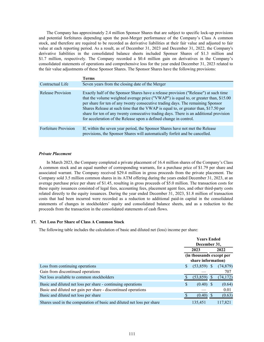 The Company has approximately 2.4 million Sponsor Shares that are subject to specific lock-up provisions and potential forfeitures depending upon the post-Merger performance of the Company’s Class A common stock, and therefore are required to be recorded as derivative liabilities at their fair value and adjusted to fair value at each reporting period. As a result, as of December 31, 2023 and December 31, 2022, the Company's derivative liabilities in the consolidated balance sheets included Sponsor Shares of $1.3 million and $1.7 million, respectively. The Company recorded a $0.4 million gain on derivatives in the Company’s consolidated statements of operations and comprehensive loss for the year ended December 31, 2023 related to the fair value adjustments of these Sponsor Shares. The Sponsor Shares have the following provisions: Terms Contractual Life Seven years from the closing date of the Merger Release Provision Exactly half of the Sponsor Shares have a release provision ("Release") at such time that the volume weighted average price ("VWAP") is equal to, or greater than, $15.00 per share for ten of any twenty consecutive trading days. The remaining Sponsor Shares Release at such time that the VWAP is equal to, or greater than, $17.50 per share for ten of any twenty consecutive trading days. There is an additional provision for acceleration of the Release upon a defined change in control. Forfeiture Provision If, within the seven year period, the Sponsor Shares have not met the Release provisions, the Sponsor Shares will automatically forfeit and be cancelled. Private Placement In March 2023, the Company completed a private placement of 16.4 million shares of the Company’s Class A common stock and an equal number of corresponding warrants, for a purchase price of $1.79 per share and associated warrant. The Company received $29.4 million in gross proceeds from the private placement. The Company sold 3.5 million common shares in its ATM offering during the years ended December 31, 2023, at an average purchase price per share of $1.45, resulting in gross proceeds of $5.0 million. The transaction costs for these equity issuances consisted of legal fees, accounting fees, placement agent fees, and other third-party costs related directly to the equity issuances. During the year ended December 31, 2023, $1.8 million of transaction costs that had been incurred were recorded as a reduction to additional paid-in capital in the consolidated statements of changes in stockholders’ equity and consolidated balance sheets, and as a reduction to the proceeds from the transaction in the consolidated statements of cash flows. 17. Net Loss Per Share of Class A Common Stock The following table includes the calculation of basic and diluted net (loss) income per share: Years Ended December 31, 2023 2022 (in thousands except per share information) Loss from continuing operations $ (53,859) $ (74,879) Gain from discontinued operations — 707 Net loss available to common stockholders $ (53,859) $ (74,172) Basic and diluted net loss per share - continuing operations $ (0.40) $ (0.64) Basic and diluted net gain per share - discontinued operations — 0.01 Basic and diluted net loss per share $ (0.40) $ (0.63) Shares used in the computation of basic and diluted net loss per share 135,451 117,821 111