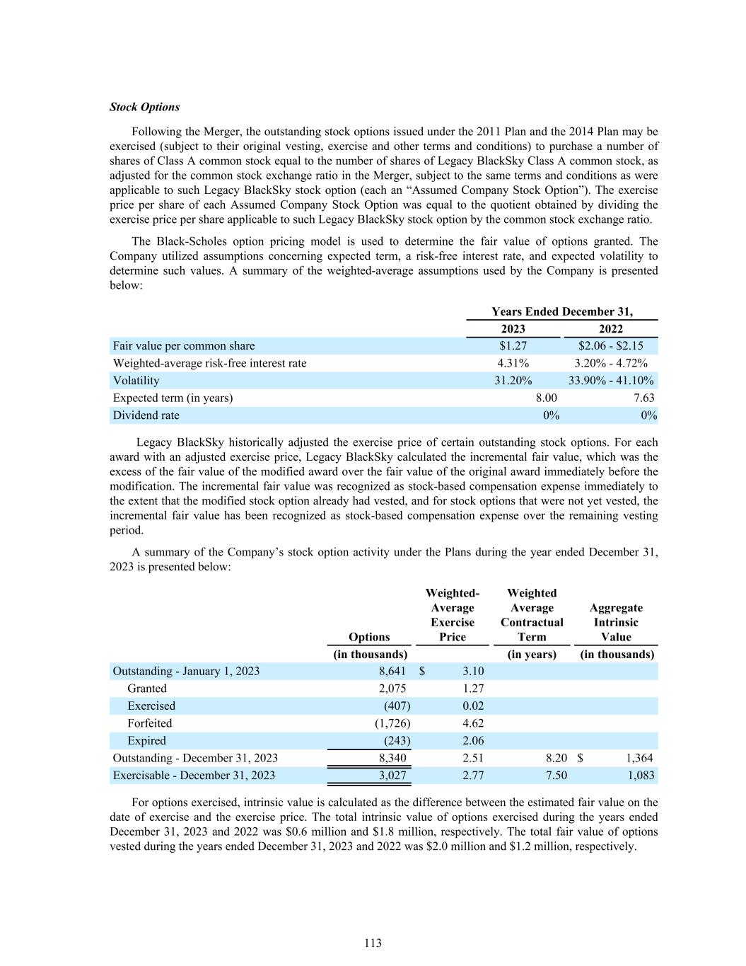 Stock Options Following the Merger, the outstanding stock options issued under the 2011 Plan and the 2014 Plan may be exercised (subject to their original vesting, exercise and other terms and conditions) to purchase a number of shares of Class A common stock equal to the number of shares of Legacy BlackSky Class A common stock, as adjusted for the common stock exchange ratio in the Merger, subject to the same terms and conditions as were applicable to such Legacy BlackSky stock option (each an “Assumed Company Stock Option”). The exercise price per share of each Assumed Company Stock Option was equal to the quotient obtained by dividing the exercise price per share applicable to such Legacy BlackSky stock option by the common stock exchange ratio. The Black-Scholes option pricing model is used to determine the fair value of options granted. The Company utilized assumptions concerning expected term, a risk-free interest rate, and expected volatility to determine such values. A summary of the weighted-average assumptions used by the Company is presented below: Years Ended December 31, 2023 2022 Fair value per common share $1.27 $2.06 - $2.15 Weighted-average risk-free interest rate 4.31% 3.20% - 4.72% Volatility 31.20% 33.90% - 41.10% Expected term (in years) 8.00 7.63 Dividend rate 0 % 0 % Legacy BlackSky historically adjusted the exercise price of certain outstanding stock options. For each award with an adjusted exercise price, Legacy BlackSky calculated the incremental fair value, which was the excess of the fair value of the modified award over the fair value of the original award immediately before the modification. The incremental fair value was recognized as stock-based compensation expense immediately to the extent that the modified stock option already had vested, and for stock options that were not yet vested, the incremental fair value has been recognized as stock-based compensation expense over the remaining vesting period. A summary of the Company’s stock option activity under the Plans during the year ended December 31, 2023 is presented below: Options Weighted- Average Exercise Price Weighted Average Contractual Term Aggregate Intrinsic Value (in thousands) (in years) (in thousands) Outstanding - January 1, 2023 8,641 $ 3.10 Granted 2,075 1.27 Exercised (407) 0.02 Forfeited (1,726) 4.62 Expired (243) 2.06 Outstanding - December 31, 2023 8,340 2.51 8.20 $ 1,364 Exercisable - December 31, 2023 3,027 2.77 7.50 1,083 For options exercised, intrinsic value is calculated as the difference between the estimated fair value on the date of exercise and the exercise price. The total intrinsic value of options exercised during the years ended December 31, 2023 and 2022 was $0.6 million and $1.8 million, respectively. The total fair value of options vested during the years ended December 31, 2023 and 2022 was $2.0 million and $1.2 million, respectively. 113