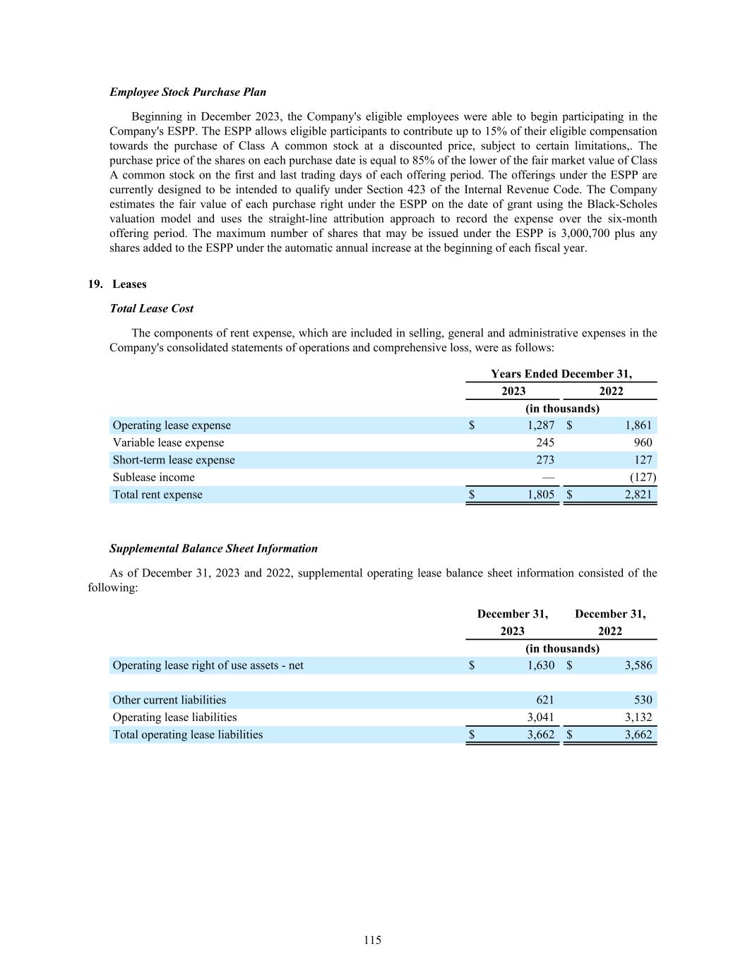 Employee Stock Purchase Plan Beginning in December 2023, the Company's eligible employees were able to begin participating in the Company's ESPP. The ESPP allows eligible participants to contribute up to 15% of their eligible compensation towards the purchase of Class A common stock at a discounted price, subject to certain limitations,. The purchase price of the shares on each purchase date is equal to 85% of the lower of the fair market value of Class A common stock on the first and last trading days of each offering period. The offerings under the ESPP are currently designed to be intended to qualify under Section 423 of the Internal Revenue Code. The Company estimates the fair value of each purchase right under the ESPP on the date of grant using the Black-Scholes valuation model and uses the straight-line attribution approach to record the expense over the six-month offering period. The maximum number of shares that may be issued under the ESPP is 3,000,700 plus any shares added to the ESPP under the automatic annual increase at the beginning of each fiscal year. 19. Leases Total Lease Cost The components of rent expense, which are included in selling, general and administrative expenses in the Company's consolidated statements of operations and comprehensive loss, were as follows: Years Ended December 31, 2023 2022 (in thousands) Operating lease expense $ 1,287 $ 1,861 Variable lease expense 245 960 Short-term lease expense 273 127 Sublease income — (127) Total rent expense $ 1,805 $ 2,821 Supplemental Balance Sheet Information As of December 31, 2023 and 2022, supplemental operating lease balance sheet information consisted of the following: December 31, December 31, 2023 2022 (in thousands) Operating lease right of use assets - net $ 1,630 $ 3,586 Other current liabilities 621 530 Operating lease liabilities 3,041 3,132 Total operating lease liabilities $ 3,662 $ 3,662 115
