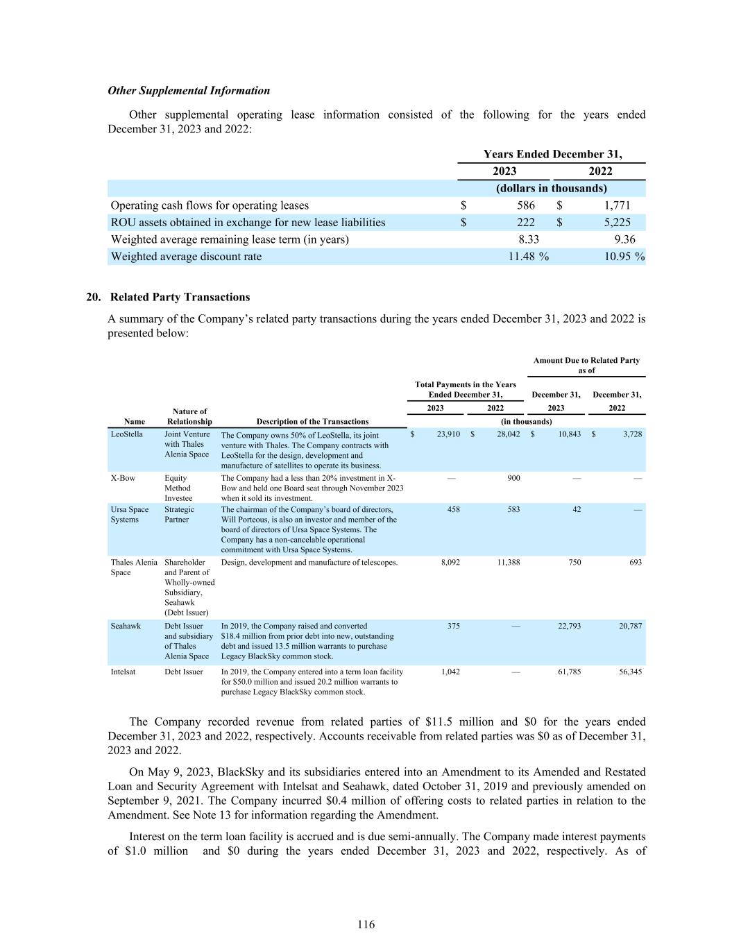 Other Supplemental Information Other supplemental operating lease information consisted of the following for the years ended December 31, 2023 and 2022: Years Ended December 31, 2023 2022 (dollars in thousands) Operating cash flows for operating leases $ 586 $ 1,771 ROU assets obtained in exchange for new lease liabilities $ 222 $ 5,225 Weighted average remaining lease term (in years) 8.33 9.36 Weighted average discount rate 11.48 % 10.95 % 20. Related Party Transactions A summary of the Company’s related party transactions during the years ended December 31, 2023 and 2022 is presented below: Amount Due to Related Party as of Total Payments in the Years Ended December 31, December 31, December 31, Nature of Relationship 2023 2022 2023 2022 Name Description of the Transactions (in thousands) LeoStella Joint Venture with Thales Alenia Space The Company owns 50% of LeoStella, its joint venture with Thales. The Company contracts with LeoStella for the design, development and manufacture of satellites to operate its business. $ 23,910 $ 28,042 $ 10,843 $ 3,728 X-Bow Equity Method Investee The Company had a less than 20% investment in X- Bow and held one Board seat through November 2023 when it sold its investment. — 900 — — Ursa Space Systems Strategic Partner The chairman of the Company’s board of directors, Will Porteous, is also an investor and member of the board of directors of Ursa Space Systems. The Company has a non-cancelable operational commitment with Ursa Space Systems. 458 583 42 — Thales Alenia Space Shareholder and Parent of Wholly-owned Subsidiary, Seahawk (Debt Issuer) Design, development and manufacture of telescopes. 8,092 11,388 750 693 Seahawk Debt Issuer and subsidiary of Thales Alenia Space In 2019, the Company raised and converted $18.4 million from prior debt into new, outstanding debt and issued 13.5 million warrants to purchase Legacy BlackSky common stock. 375 — 22,793 20,787 Intelsat Debt Issuer In 2019, the Company entered into a term loan facility for $50.0 million and issued 20.2 million warrants to purchase Legacy BlackSky common stock. 1,042 — 61,785 56,345 The Company recorded revenue from related parties of $11.5 million and $0 for the years ended December 31, 2023 and 2022, respectively. Accounts receivable from related parties was $0 as of December 31, 2023 and 2022. On May 9, 2023, BlackSky and its subsidiaries entered into an Amendment to its Amended and Restated Loan and Security Agreement with Intelsat and Seahawk, dated October 31, 2019 and previously amended on September 9, 2021. The Company incurred $0.4 million of offering costs to related parties in relation to the Amendment. See Note 13 for information regarding the Amendment. Interest on the term loan facility is accrued and is due semi-annually. The Company made interest payments of $1.0 million and $0 during the years ended December 31, 2023 and 2022, respectively. As of 116