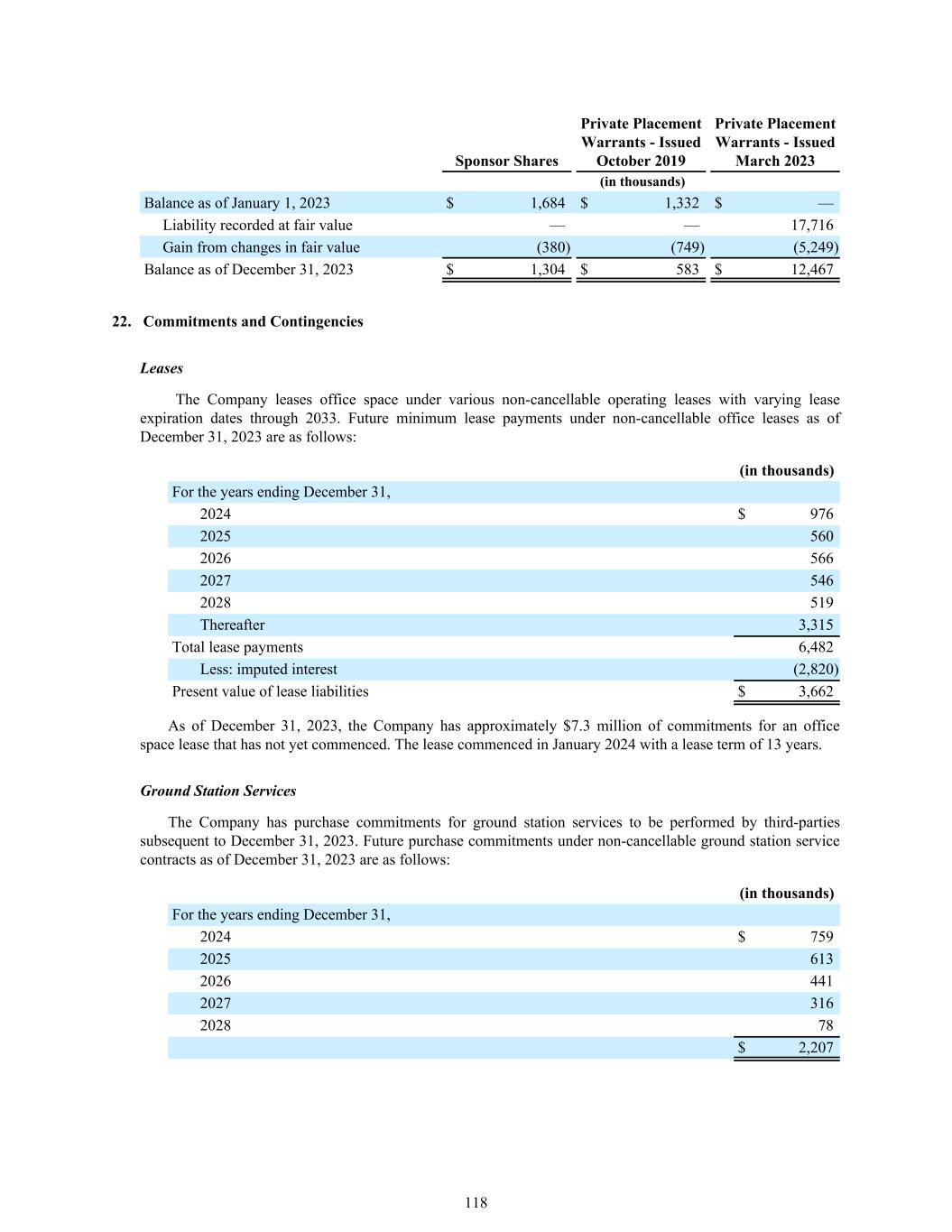Sponsor Shares Private Placement Warrants - Issued October 2019 Private Placement Warrants - Issued March 2023 (in thousands) Balance as of January 1, 2023 $ 1,684 $ 1,332 $ — Liability recorded at fair value — — 17,716 Gain from changes in fair value (380) (749) (5,249) Balance as of December 31, 2023 $ 1,304 $ 583 $ 12,467 22. Commitments and Contingencies Leases The Company leases office space under various non-cancellable operating leases with varying lease expiration dates through 2033. Future minimum lease payments under non-cancellable office leases as of December 31, 2023 are as follows: (in thousands) For the years ending December 31, 2024 $ 976 2025 560 2026 566 2027 546 2028 519 Thereafter 3,315 Total lease payments 6,482 Less: imputed interest (2,820) Present value of lease liabilities $ 3,662 As of December 31, 2023, the Company has approximately $7.3 million of commitments for an office space lease that has not yet commenced. The lease commenced in January 2024 with a lease term of 13 years. Ground Station Services The Company has purchase commitments for ground station services to be performed by third-parties subsequent to December 31, 2023. Future purchase commitments under non-cancellable ground station service contracts as of December 31, 2023 are as follows: (in thousands) For the years ending December 31, 2024 $ 759 2025 613 2026 441 2027 316 2028 78 $ 2,207 118