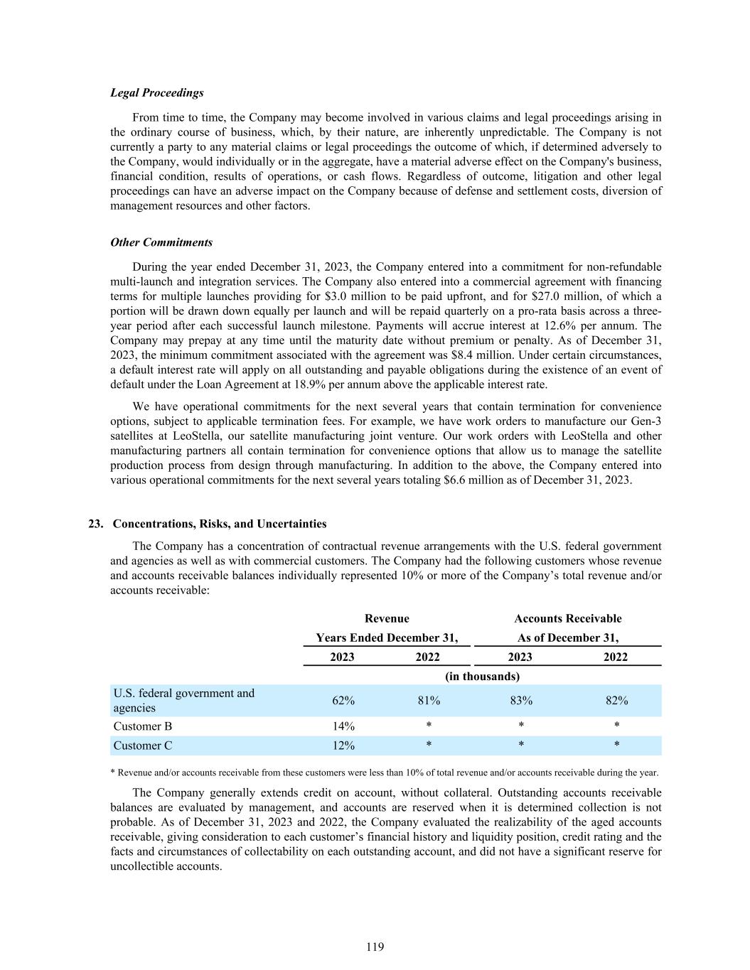 Legal Proceedings From time to time, the Company may become involved in various claims and legal proceedings arising in the ordinary course of business, which, by their nature, are inherently unpredictable. The Company is not currently a party to any material claims or legal proceedings the outcome of which, if determined adversely to the Company, would individually or in the aggregate, have a material adverse effect on the Company's business, financial condition, results of operations, or cash flows. Regardless of outcome, litigation and other legal proceedings can have an adverse impact on the Company because of defense and settlement costs, diversion of management resources and other factors. Other Commitments During the year ended December 31, 2023, the Company entered into a commitment for non-refundable multi-launch and integration services. The Company also entered into a commercial agreement with financing terms for multiple launches providing for $3.0 million to be paid upfront, and for $27.0 million, of which a portion will be drawn down equally per launch and will be repaid quarterly on a pro-rata basis across a three- year period after each successful launch milestone. Payments will accrue interest at 12.6% per annum. The Company may prepay at any time until the maturity date without premium or penalty. As of December 31, 2023, the minimum commitment associated with the agreement was $8.4 million. Under certain circumstances, a default interest rate will apply on all outstanding and payable obligations during the existence of an event of default under the Loan Agreement at 18.9% per annum above the applicable interest rate. We have operational commitments for the next several years that contain termination for convenience options, subject to applicable termination fees. For example, we have work orders to manufacture our Gen-3 satellites at LeoStella, our satellite manufacturing joint venture. Our work orders with LeoStella and other manufacturing partners all contain termination for convenience options that allow us to manage the satellite production process from design through manufacturing. In addition to the above, the Company entered into various operational commitments for the next several years totaling $6.6 million as of December 31, 2023. 23. Concentrations, Risks, and Uncertainties The Company has a concentration of contractual revenue arrangements with the U.S. federal government and agencies as well as with commercial customers. The Company had the following customers whose revenue and accounts receivable balances individually represented 10% or more of the Company’s total revenue and/or accounts receivable: Revenue Accounts Receivable Years Ended December 31, As of December 31, 2023 2022 2023 2022 (in thousands) U.S. federal government and agencies 62% 81% 83% 82% Customer B 14% * * * Customer C 12% * * * * Revenue and/or accounts receivable from these customers were less than 10% of total revenue and/or accounts receivable during the year. The Company generally extends credit on account, without collateral. Outstanding accounts receivable balances are evaluated by management, and accounts are reserved when it is determined collection is not probable. As of December 31, 2023 and 2022, the Company evaluated the realizability of the aged accounts receivable, giving consideration to each customer’s financial history and liquidity position, credit rating and the facts and circumstances of collectability on each outstanding account, and did not have a significant reserve for uncollectible accounts. 119