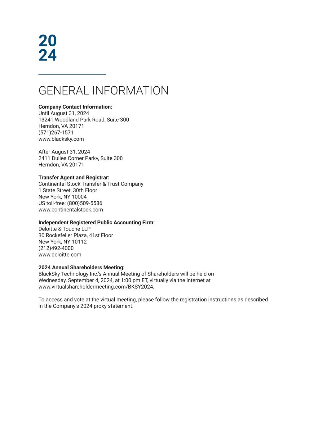GENERAL INFORMATION Company Contact Information: Until August 31, 2024 13241 Woodland Park Road, Suite 300 Herndon, VA 20171 (571)267-1571 www.blacksky.com After August 31, 2024 2411 Dulles Corner Parkv, Suite 300 Herndon, VA 20171 Transfer Agent and Registrar: Continental Stock Transfer & Trust Company 1 State Street, 30th Floor New York, NY 10004 US toll-free: (800)509-5586 www.continentalstock.com Independent Registered Public Accounting Firm: Deloitte & Touche LLP 30 Rockefeller Plaza, 41st Floor New York, NY 10112 (212)492-4000 www.deloitte.com 2024 Annual Shareholders Meeting: BlackSky Technology Inc.’s Annual Meeting of Shareholders will be held on Wednesday, September 4, 2024, at 1:00 pm ET, virtually via the internet at www.virtualshareholdermeeting.com/BKSY2024. To access and vote at the virtual meeting, please follow the registration instructions as described in the Company’s 2024 proxy statement. 20 24