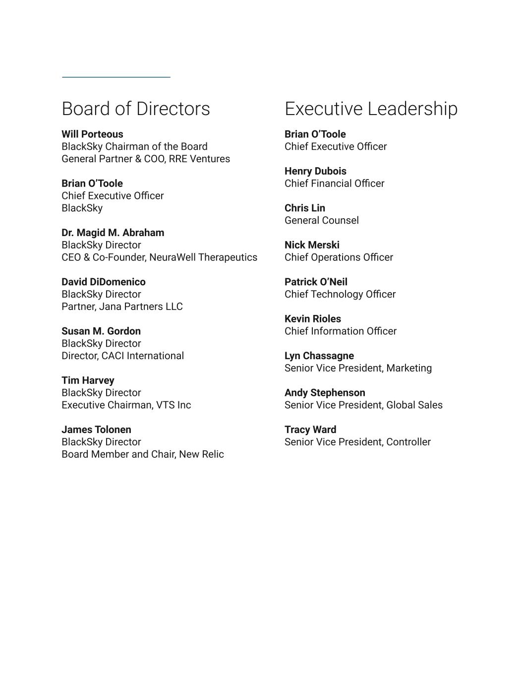 Board of Directors Will Porteous BlackSky Chairman of the Board General Partner & COO, RRE Ventures Brian O’Toole Chief Executive Officer BlackSky Dr. Magid M. Abraham BlackSky Director CEO & Co-Founder, NeuraWell Therapeutics David DiDomenico BlackSky Director Partner, Jana Partners LLC Susan M. Gordon BlackSky Director Director, CACI International Tim Harvey BlackSky Director Executive Chairman, VTS Inc James Tolonen BlackSky Director Board Member and Chair, New Relic Executive Leadership Brian O’Toole Chief Executive Officer Henry Dubois Chief Financial Officer Chris Lin General Counsel Nick Merski Chief Operations Officer Patrick O’Neil Chief Technology Officer Kevin Rioles Chief Information Officer Lyn Chassagne Senior Vice President, Marketing Andy Stephenson Senior Vice President, Global Sales Tracy Ward Senior Vice President, Controller